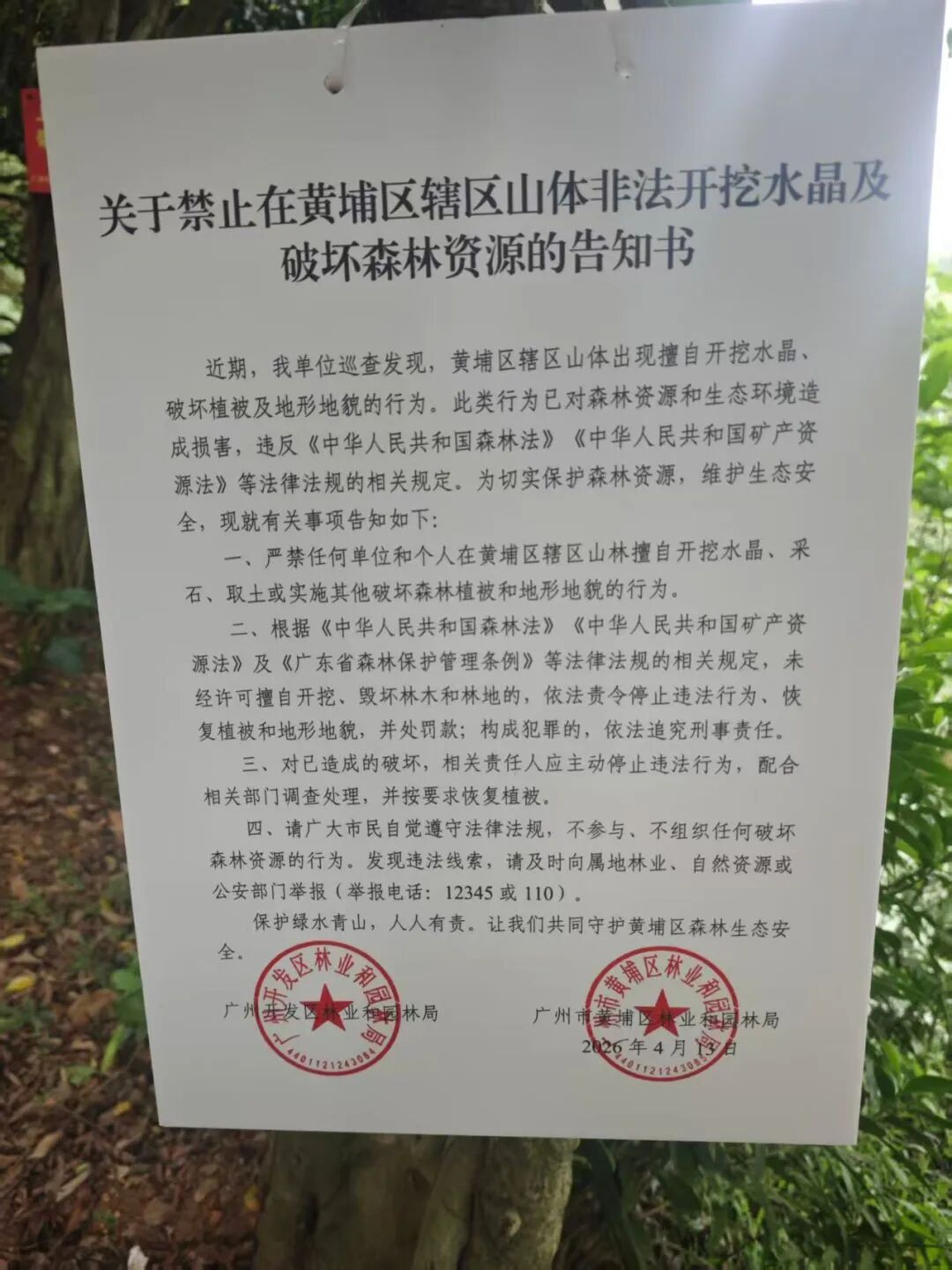 4月13日,黄埔区林业和园林局发出了《关于禁止在黄埔区辖区山体非法开挖水晶及破坏森林资源的告知书》