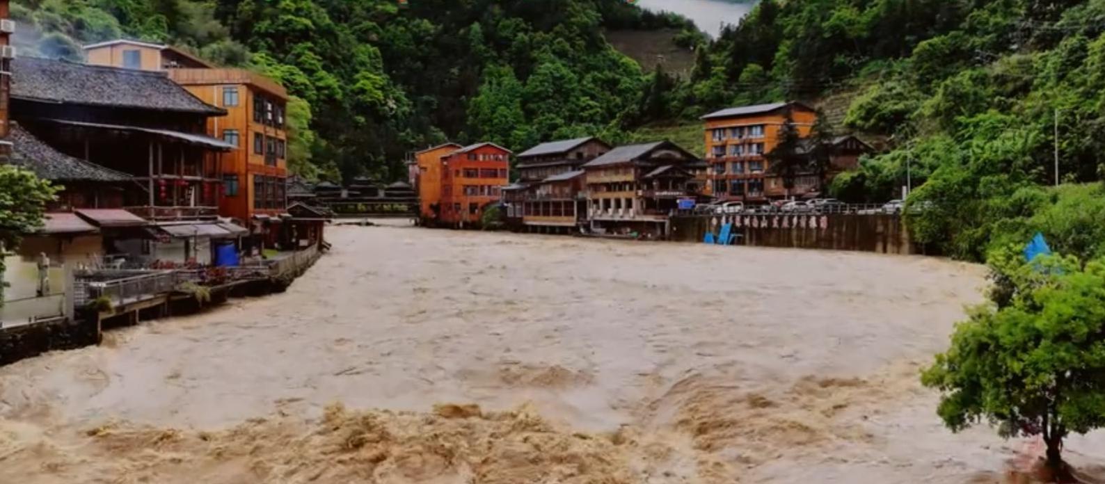 龙脊景区内的黄洛瑶寨洪水上涨