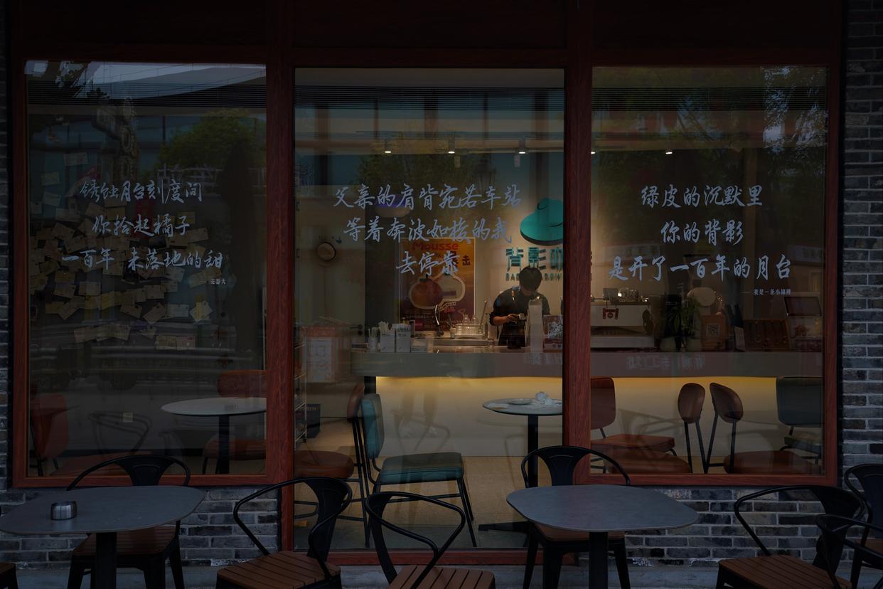 这是4月20日于浦口火车站街区拍摄的咖啡店,玻璃上写着与《背影》有关的诗句。