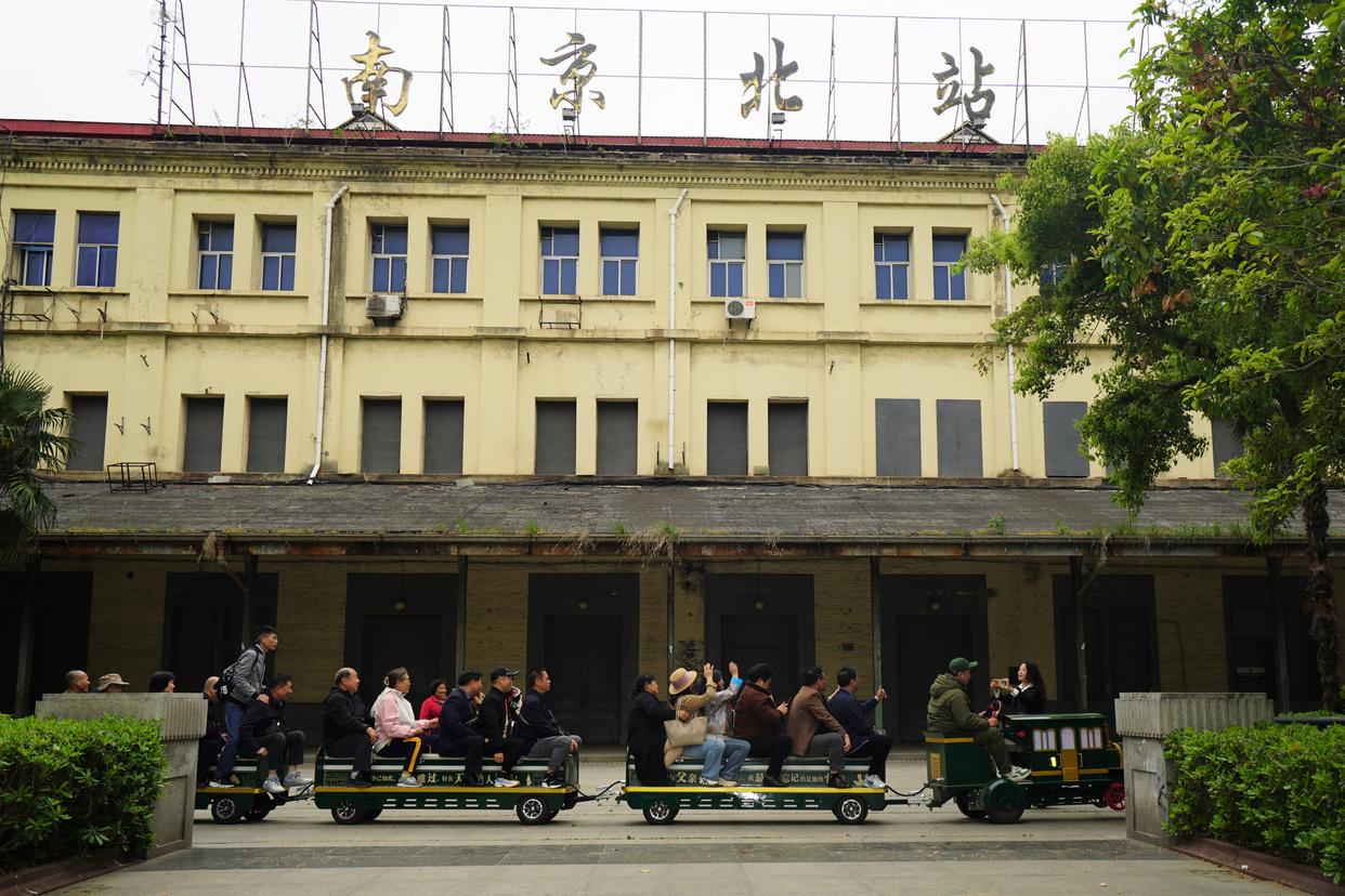4月20日,游客们在“南京北站”站楼前乘坐小火车游览。