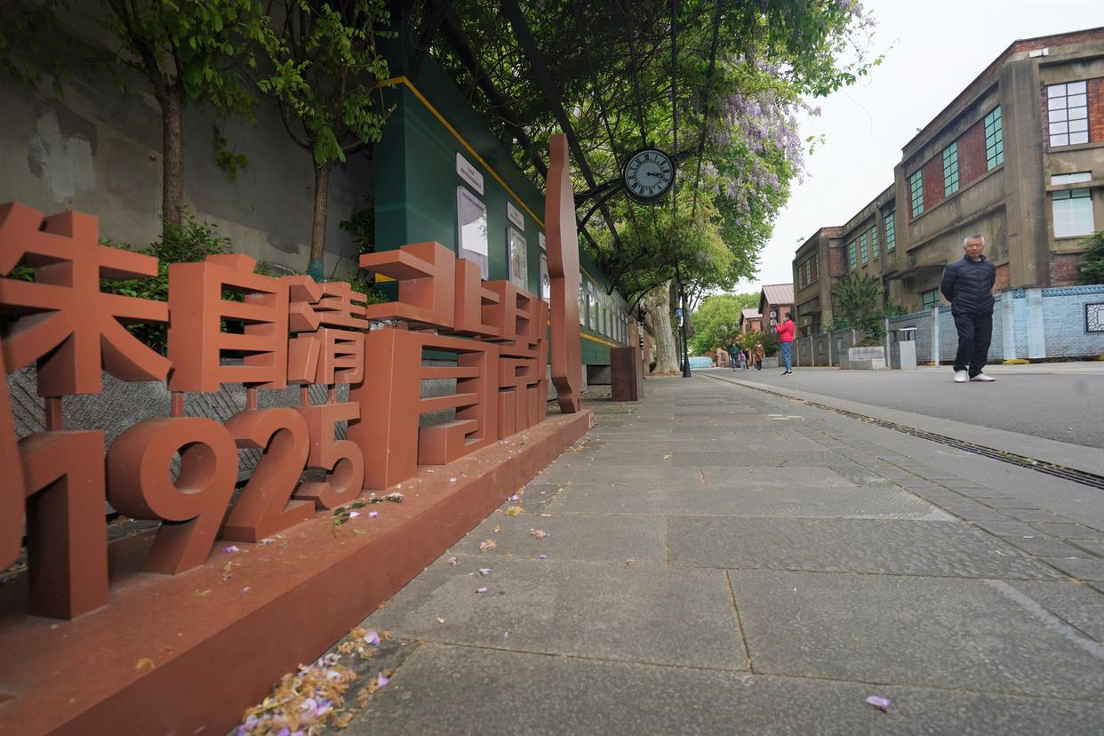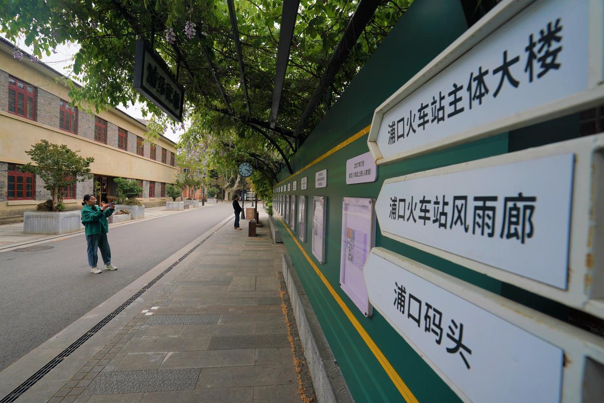 4月20日,游客在浦口火车站街区打卡拍照。