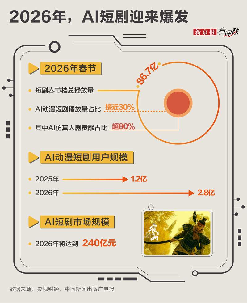 从春节档强势突围,到日常榜单全面霸屏,AI短剧正以肉眼可见的速度席卷内容市场。行业机构预测,2026年,AI动漫短剧用户规模将增长至2.8亿,市场规模有望达到240亿元。