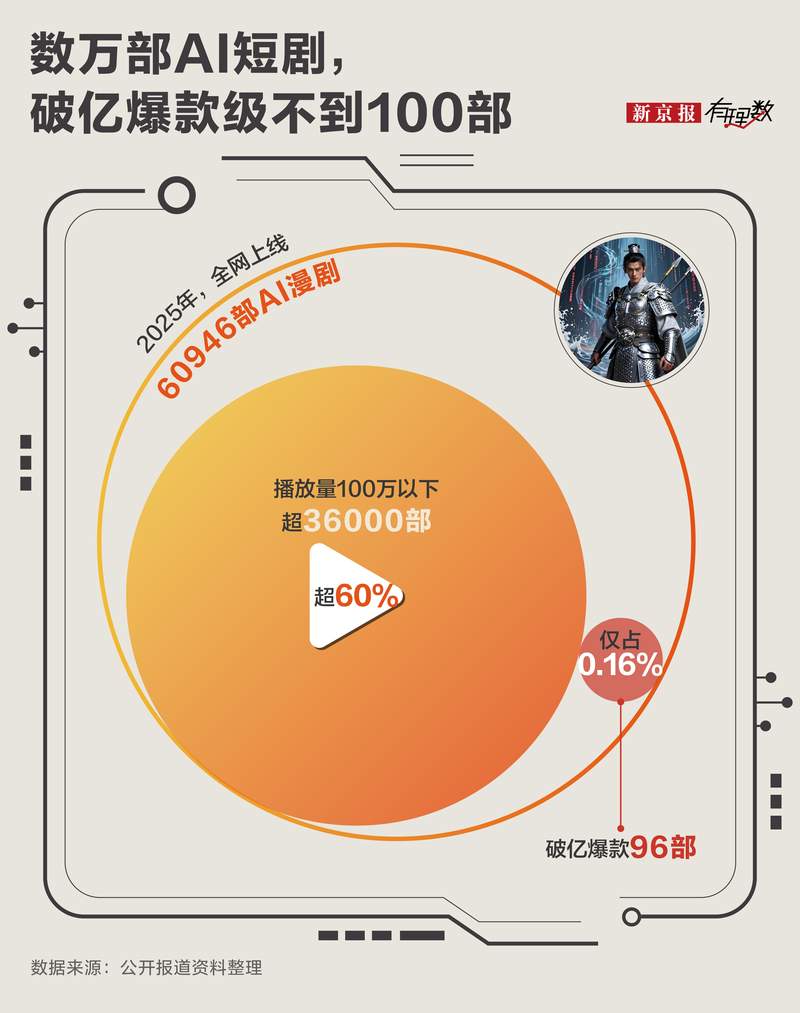 尽管单部成本极低、产出速度惊人,“一人年入几十万”的造富故事刷屏网络,但行业爆款率低到离谱。上万部上线作品中,播放量破亿的爆款屈指可数,超六成作品播放量惨淡,盈利困难。