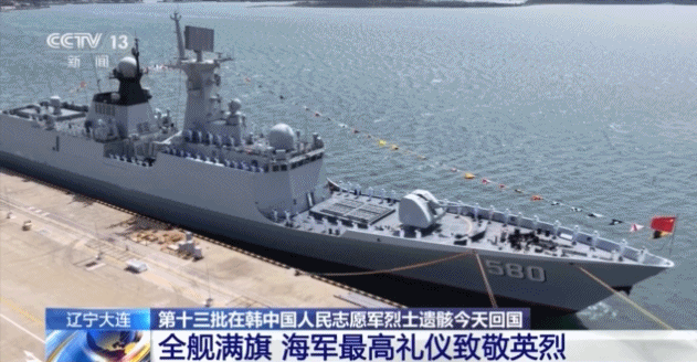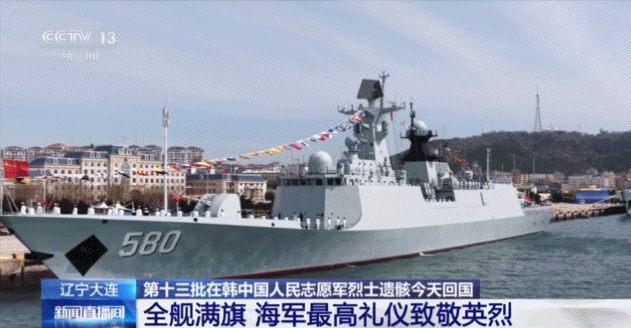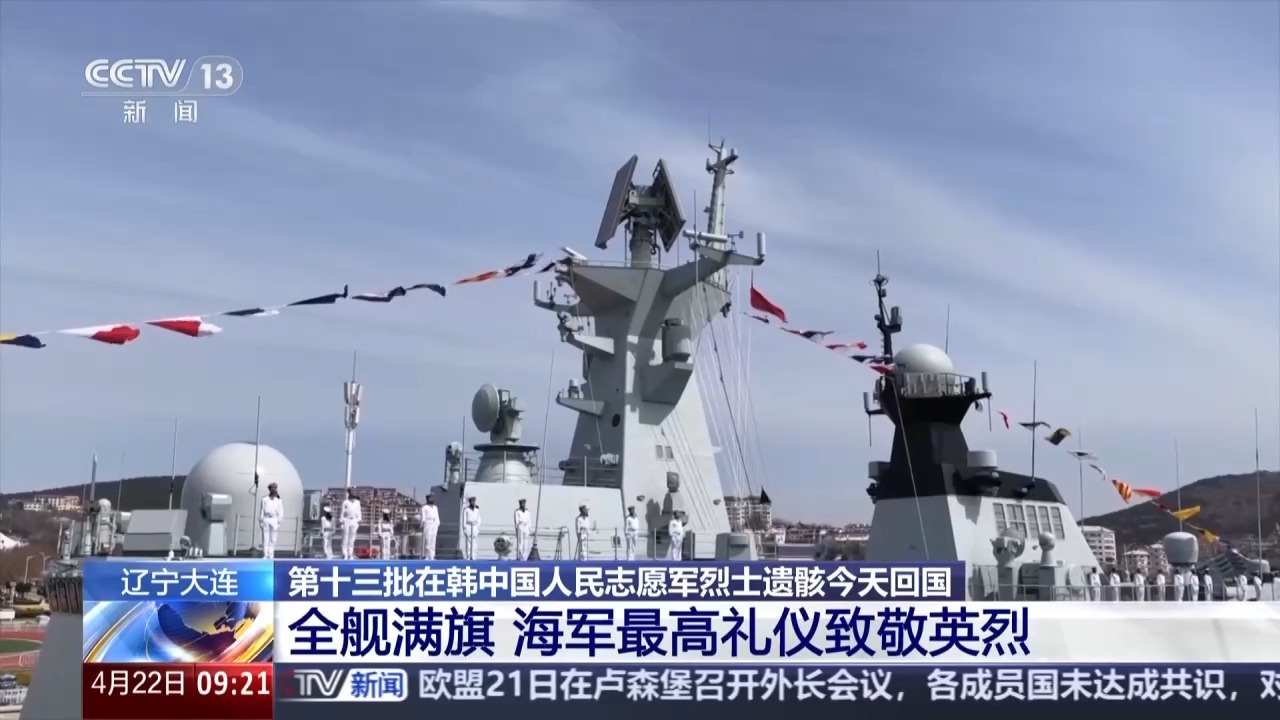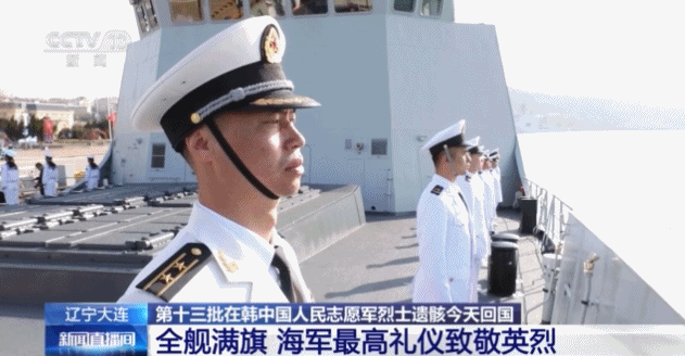 总台记者 黄璐:我此刻就在大连旅顺港内的鄂尔多斯舰上,搭载着第十三批在韩中国人民志愿军烈士遗骸及相关遗物的专机,将于今天上午从韩国仁川国际机场起飞,进入我国领空后,会从旅顺港的正上方经过,飞往沈阳桃仙国际机场。届时,中国海军将首次在这里举行庄严的迎接活动。