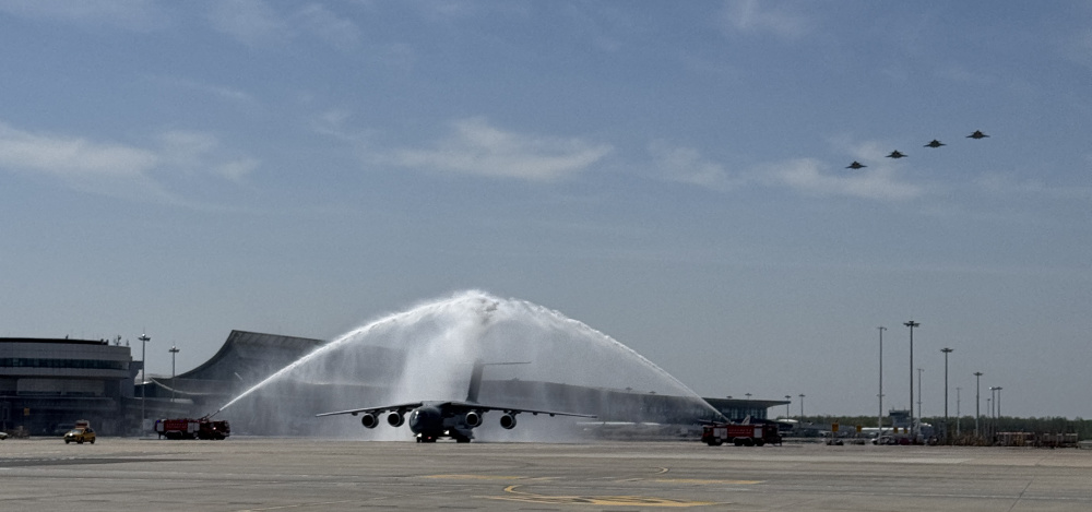 22日上午10时20分许,首次担任烈士遗骸接迎任务的运-20B进入中国领空后,4架歼-20迎接护航。“双20”列阵在沈阳桃仙国际机场上空通场,向志愿军烈士致以崇高敬意。机场以航空最高礼仪“过水门”仪式为志愿军烈士英灵洗尘。