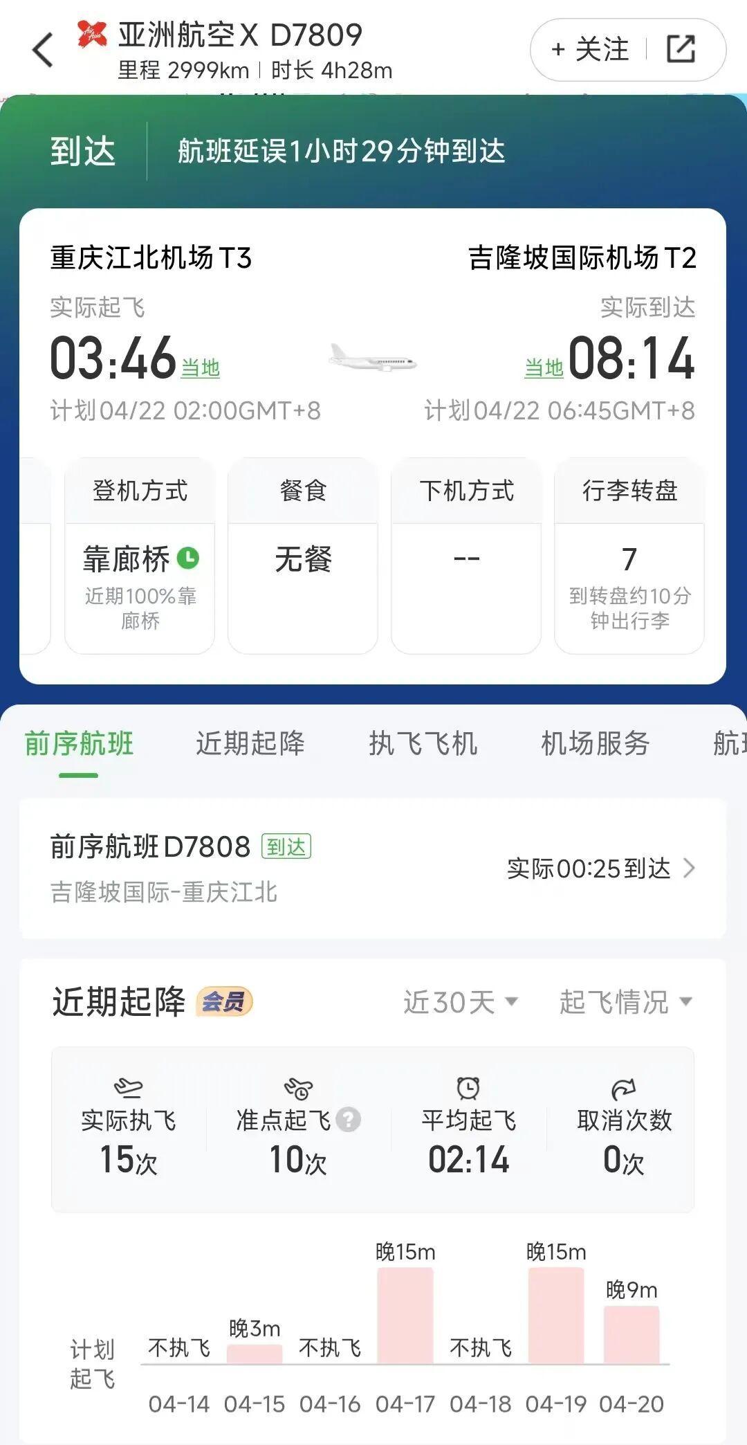 涉事航班为马来西亚亚洲航空公司D7809,原计划4月22日凌晨2点起飞,当地时间6点45分抵达目的地。航旅纵横数据显示,航班实际起飞时间为3点46分,延误1小时46分。实际抵达时间8点14分,延误1小时29分。