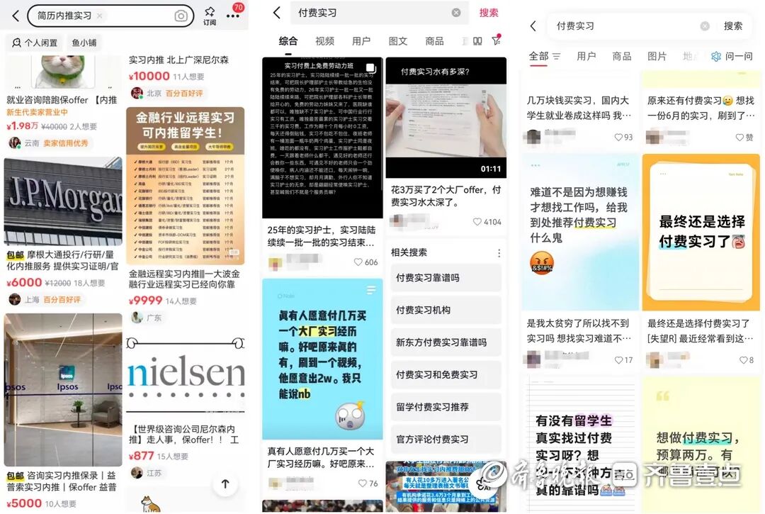 记者在多个社交平台搜索“实习内推”“付费实习”等关键词,出现了大量声称可以提供大厂实习机会的卖家。