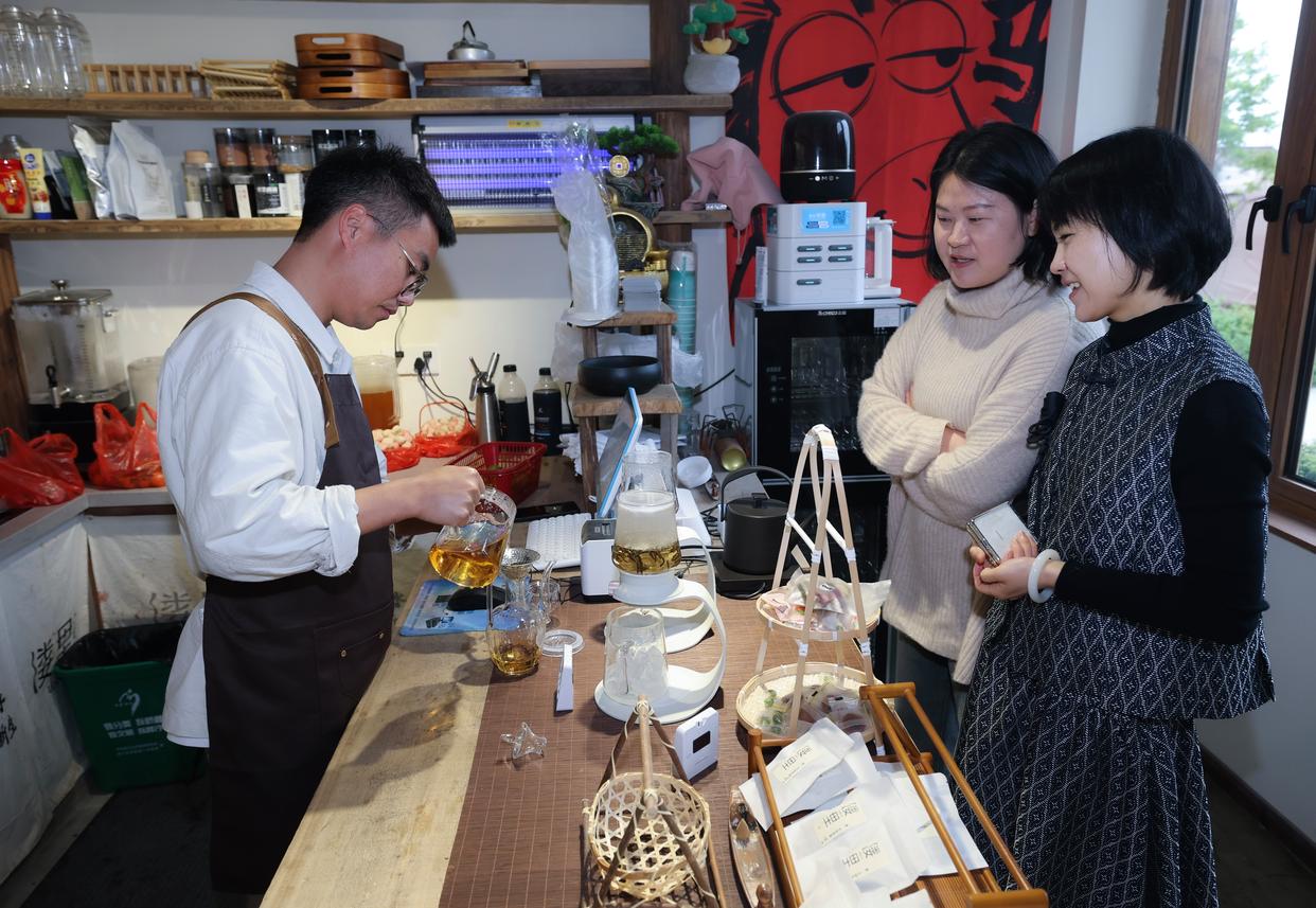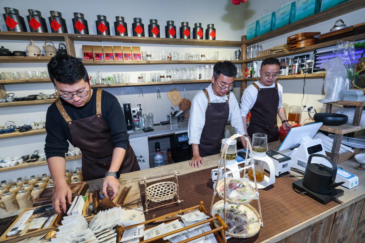 4月23日,青创客何捷(左)、孙涛(中)、谈再恒(右)在位于湖州吴兴高新区幻溇美食街的溇里·茶文化空间的工作间制作饮品。这里以传统老茶馆为基调,在吴兴高新区政策扶持、场地配套、业态对接等全链条服务下,融合现代休闲体验,打造集茶艺文化、创意生活、休闲旅游于一体的复合型文化空间,探索年轻化、场景化的乡村文旅新范式。新华社记者 徐昱 摄