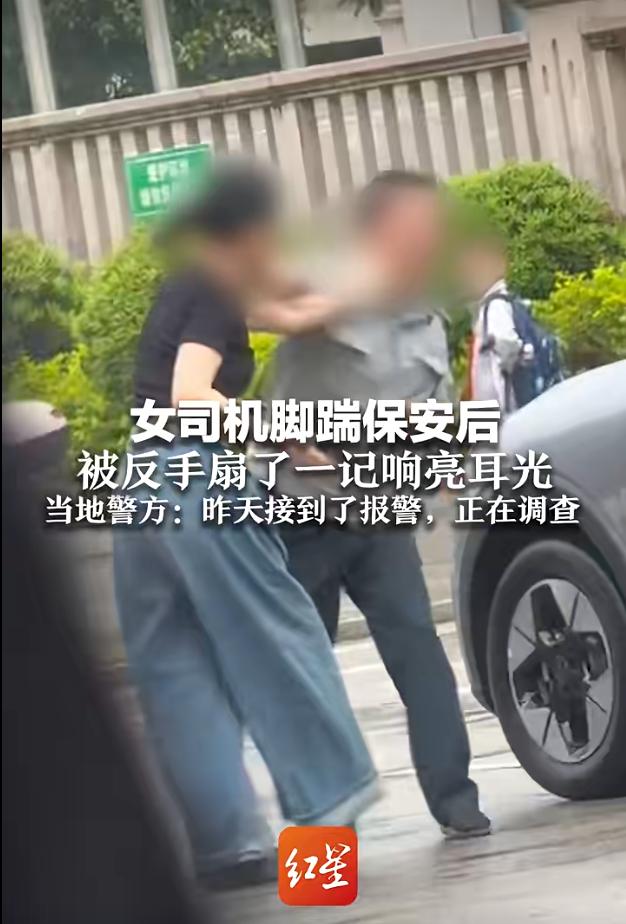 网传视频显示,一名女司机关上车门后快步上前踹了保安一脚,保安随即侧身躲开,抡圆胳膊反手扇了对方一记耳光。虽然现场人声嘈杂,但耳光的声音依旧清晰响亮,女司机眼镜当场被打歪,捂着半边脸愣在原地,随后掏出了手机。