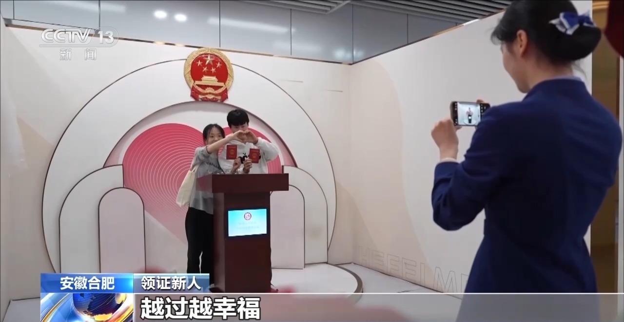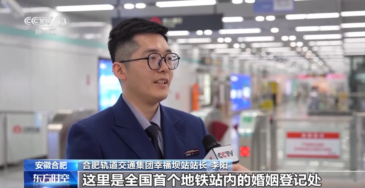 合肥轨道交通集团幸福坝站站长 李阳:这里是全国首个地铁站内的婚姻登记处——幸福坝站。截至目前,该站已累计为超过5300对新人办理了新婚登记。车站内进行了精心美化装饰,设有幸福坝打卡墙和浪漫气球,工作人员还会贴心地为新人们提供拍照服务。