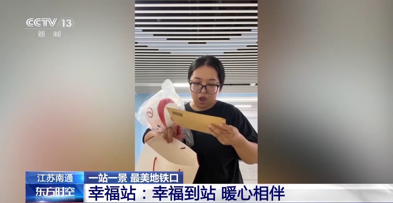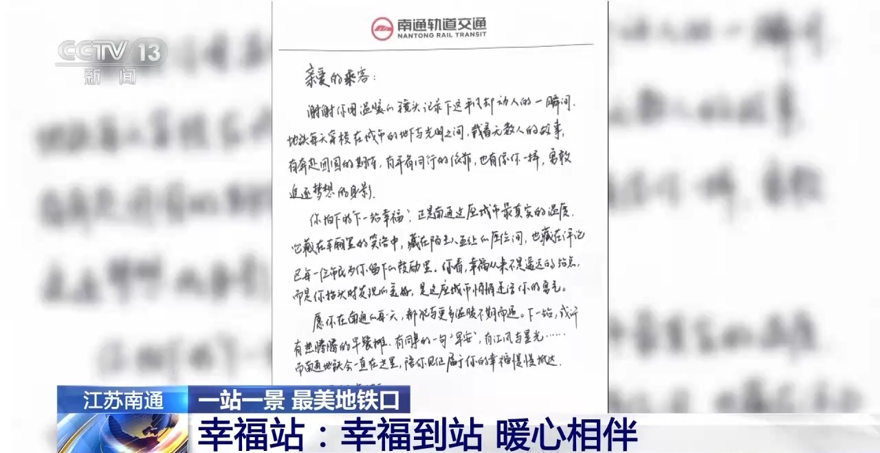 南通轨道集团运营分公司工作人员 姜一鸣:我其实自身是很感动的,我看这个评论里非常多的市民乘客,尤其是南通本地的乘客为外地游客留下很多鼓励的语言,比如说欢迎你来南通,你多幸运呀,一来就坐上了幸福的列车。所以我想,作为地铁的员工,是不是也可以做些什么,所以就想了一下,写了一封信给她。