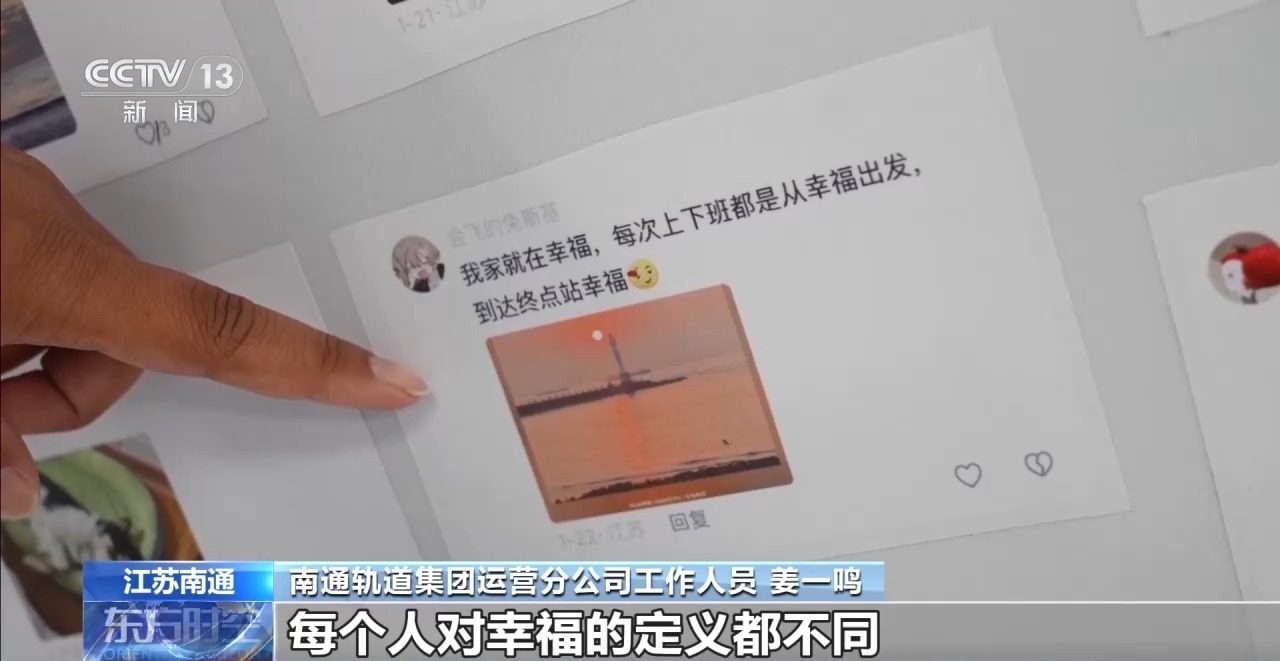 南通轨道集团运营分公司工作人员 姜一鸣:我们把这些关于幸福的点滴都汇集在这里。幸福可以是和爱的人在一起,也可以是吃到一顿很喜欢的饭。每个人对幸福的定义都不一样,我们希望大家能在这里找到属于自己的幸福见解。参观完这条长廊后,会对幸福有更多不同的想法。
