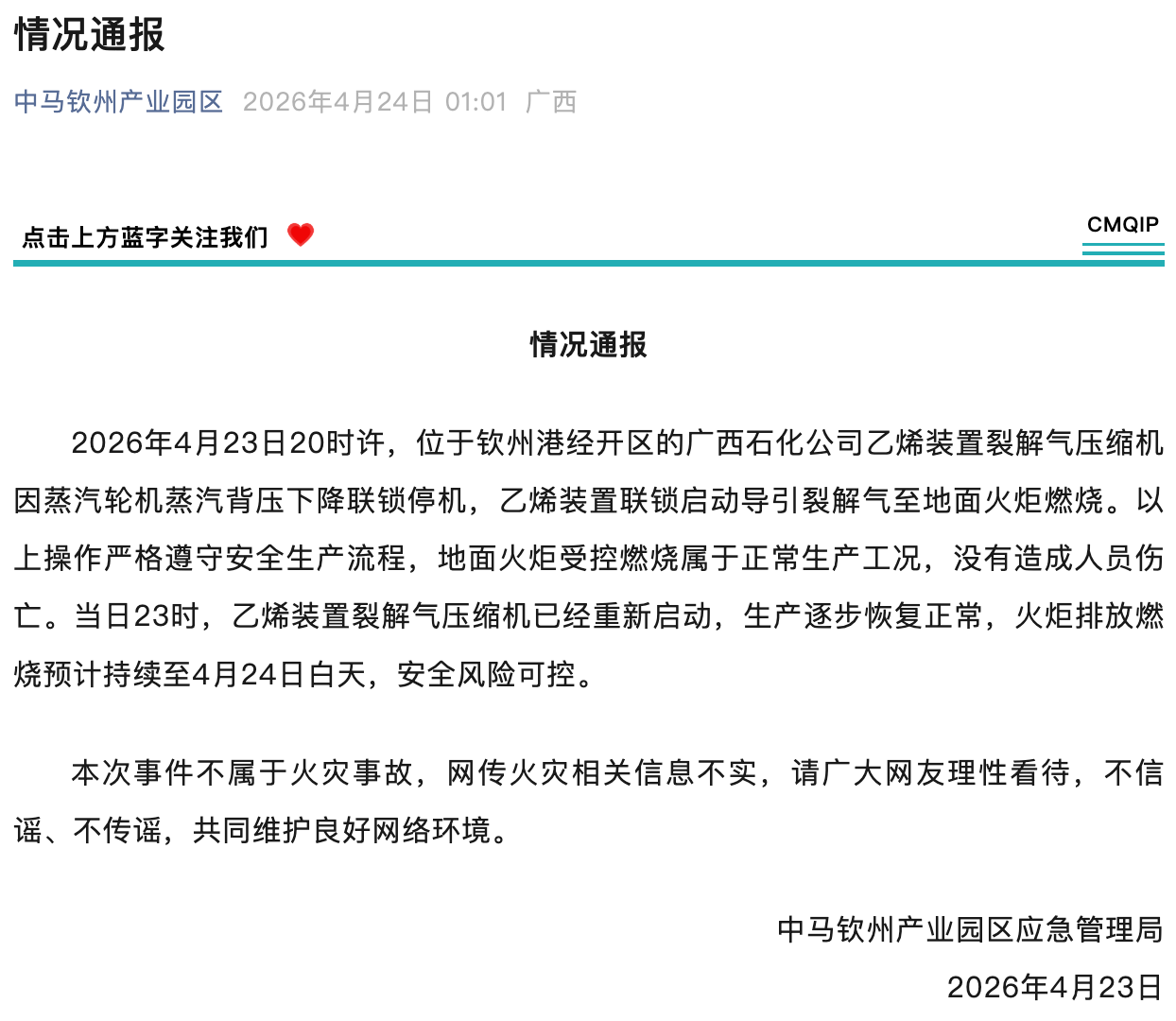 4月24日消息,广西钦州中马钦州产业园区应急管理局通报:2026年4月23日20时许,位于钦州港经开区的广西石化公司乙烯装置裂解气压缩机因蒸汽轮机蒸汽背压下降联锁停机,乙烯装置联锁启动导引裂解气至地面火炬燃烧。以上操作严格遵守安全生产流程,地面火炬受控燃烧属于正常生产工况,没有造成人员伤亡。当日23时,乙烯装置裂解气压缩机已经重新启动,生产逐步恢复正常,火炬排放燃烧预计持续至4月24日白天,安全风险可控。本次事件不属于火灾事故,网传火灾相关信息不实。