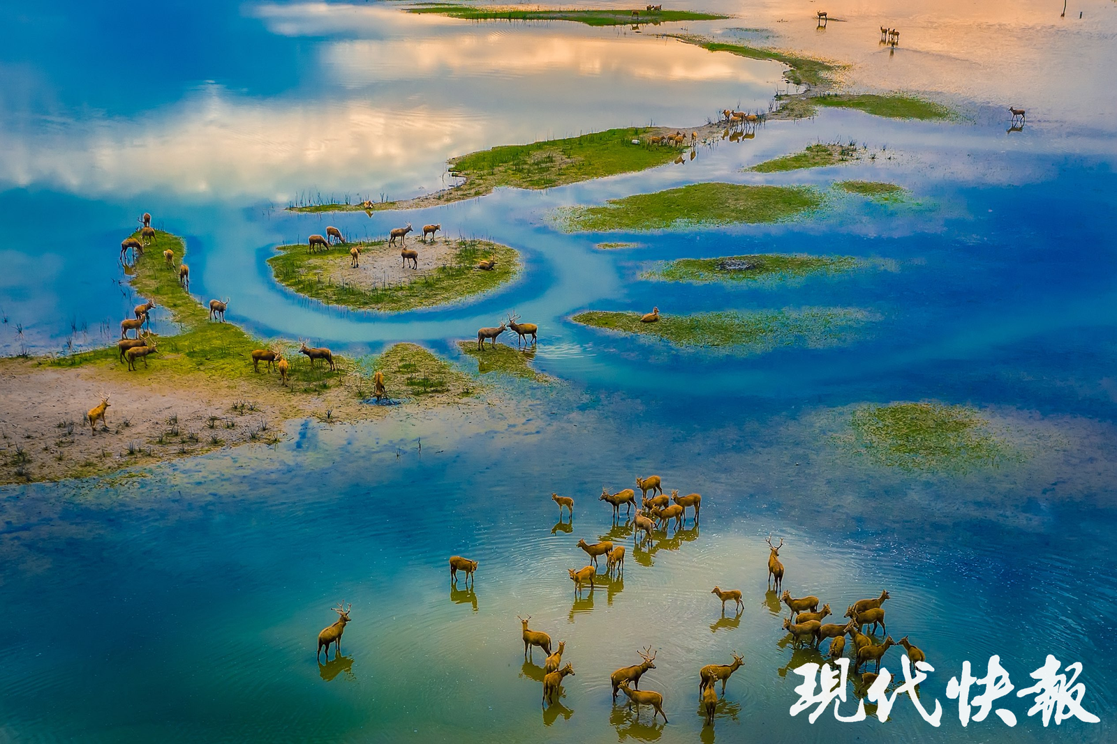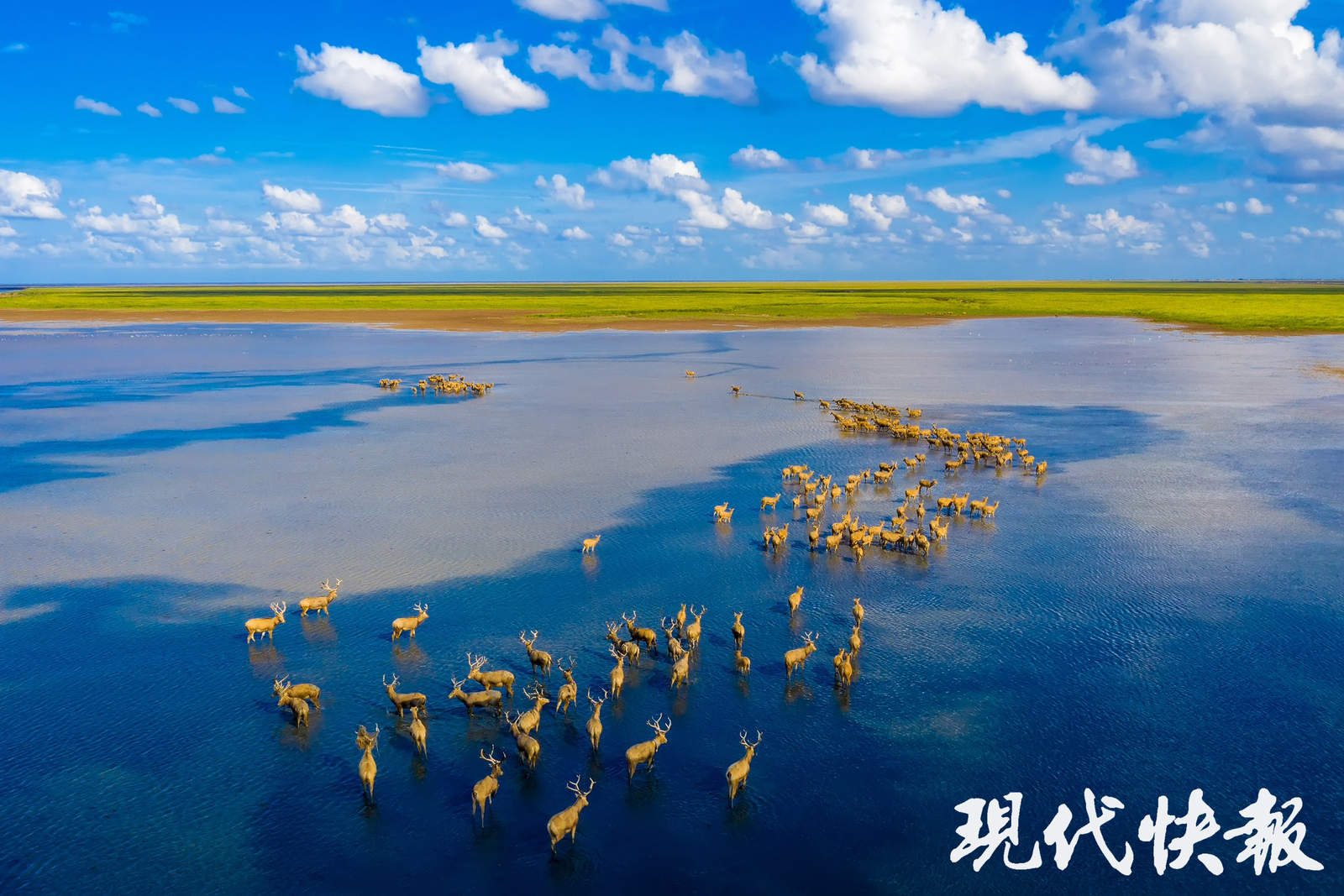春天的黄海湿地,万鸟翔集、麋鹿奔跑,阳光照耀下的广袤滩涂充满勃勃生机。