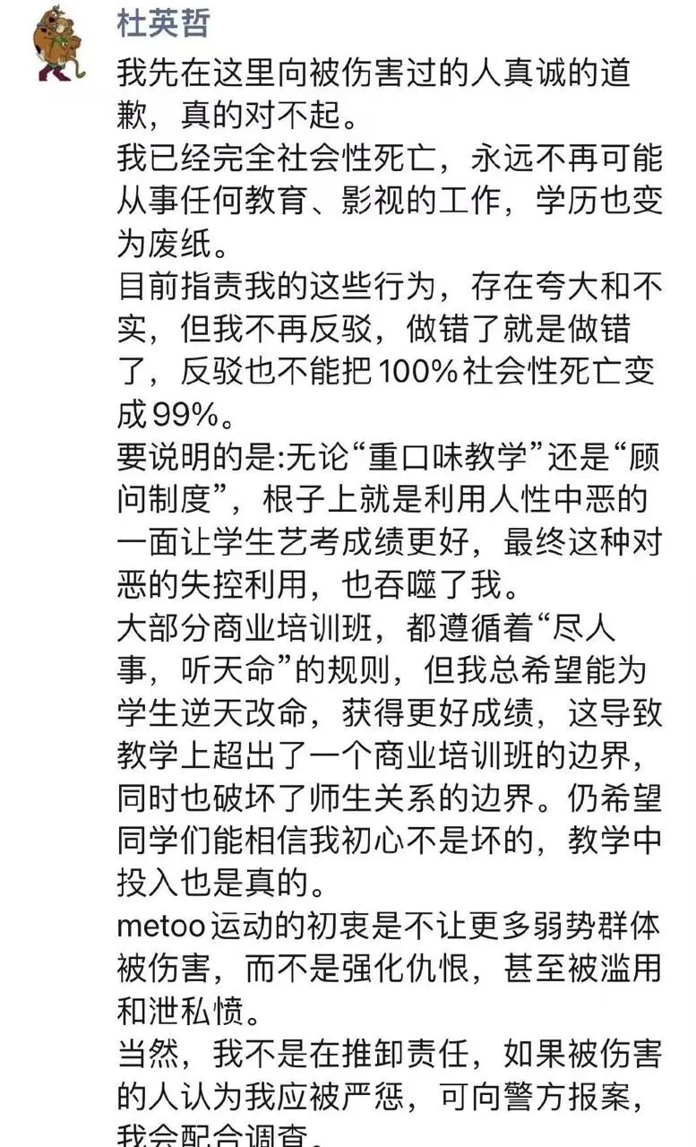 △杜英哲道歉朋友圈,受访者供图