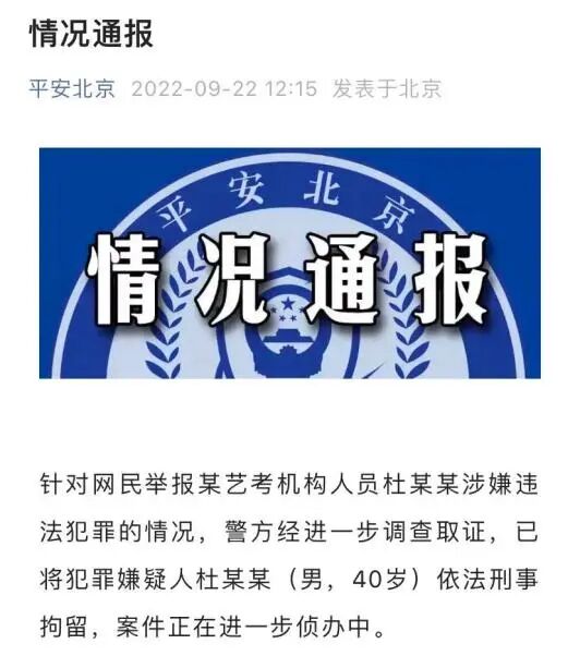 2022年9月22日,北京海淀警方就网传“某艺考机构人员杜某某涉嫌诱奸未成年人事件”发布情况通报。全文如下——
