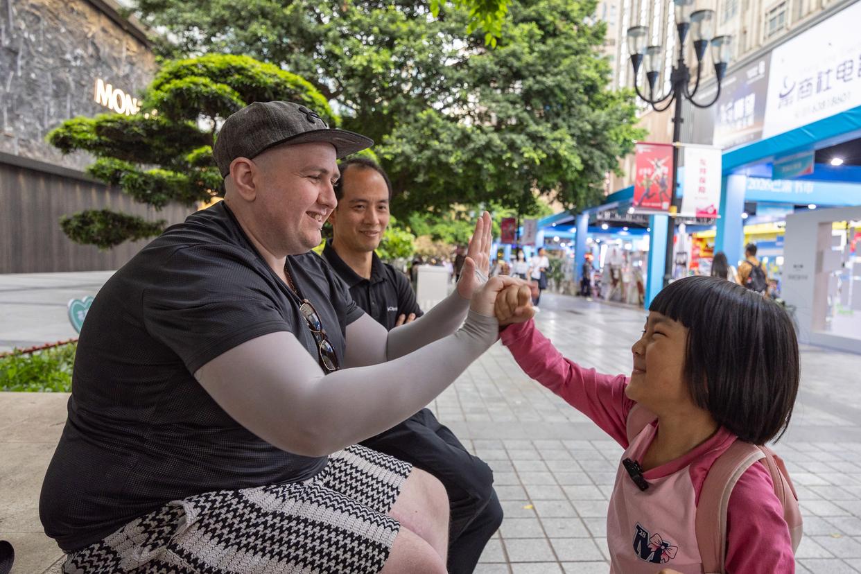 4月22日,在重庆市渝中区解放碑商圈,一名中国小女孩和来自爱尔兰的游客互动。新华社记者 黄伟 摄
