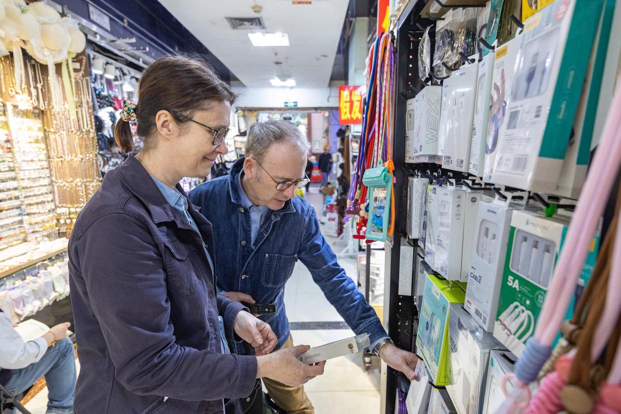 4月22日,在重庆市渝中区新重庆国际小商品批发中心,来自法国的一对夫妇在选购充电宝。新华社记者 黄伟 摄