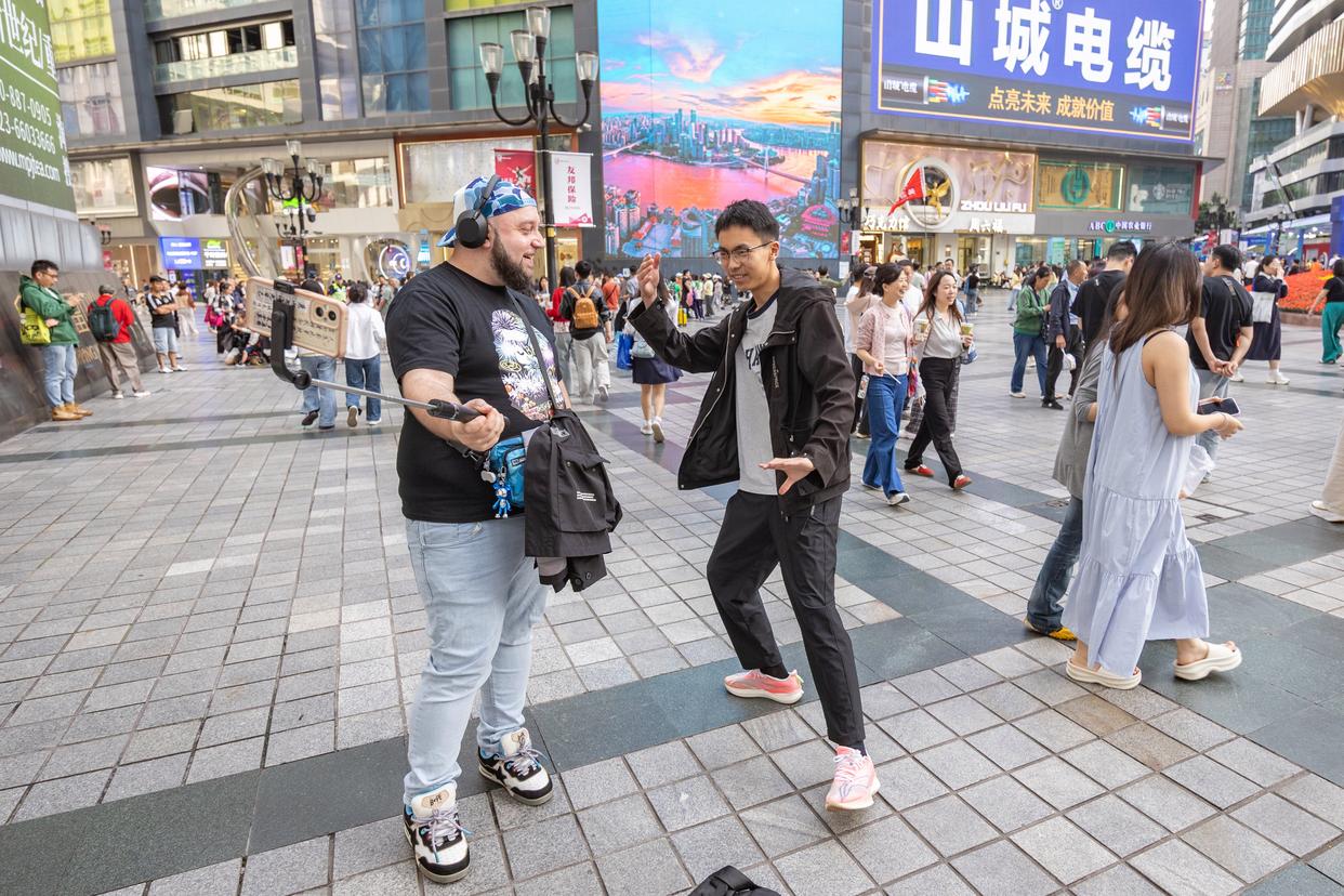 4月22日,在重庆市渝中区解放碑商圈,一名荷兰游客(左)和一名中国博主交流。新华社记者 黄伟 摄