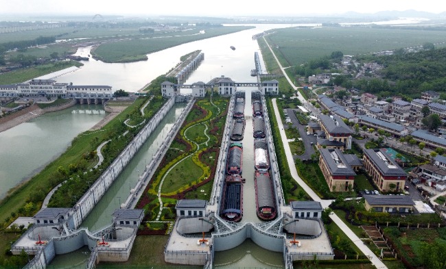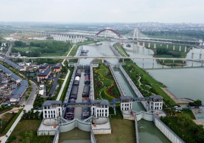 4月23日,8艘货船从江淮运河东淝河船闸通过。航拍画面显示,这里景致犹如一幅画。据了解,东淝河船闸位于引江济淮工程江淮沟通段末端、淮南市寿县八公山乡境内,距入淮口2.5公里,是江淮运河航道的入淮门户。