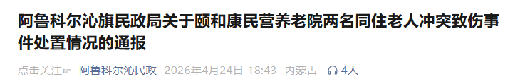 4月24日,内蒙古赤峰市阿鲁科尔沁旗民政局发布《阿鲁科尔沁旗民政局关于颐和康民营养老院两名同住老人冲突致伤事件处置情况的通报》,全文如下: