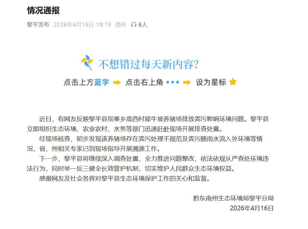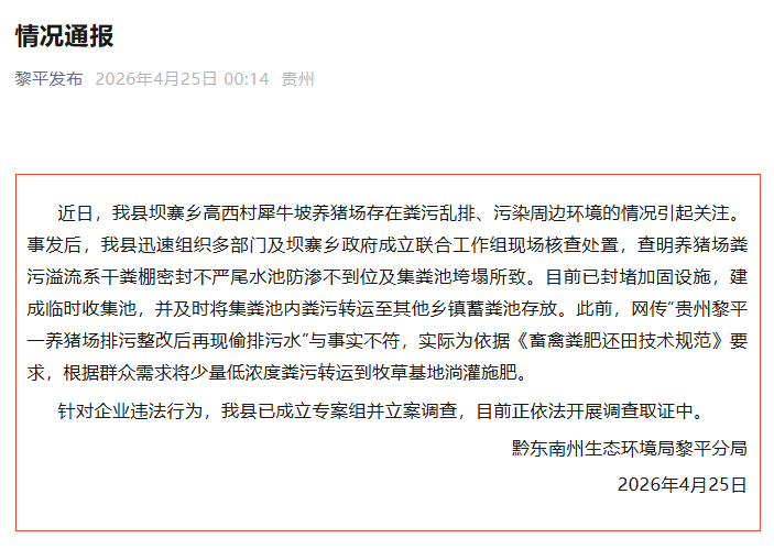 4月16日,黔东南州生态环境局黎平分局通报称,当地组织生态环境、农业农村、水务等部门迅速赶赴现场开展排查处置,初步发现该养猪场存在粪污处理不规范及粪污随雨水流入外环境等情况,专家已到现场指导开展溯源工作,将全力推进问题整改。