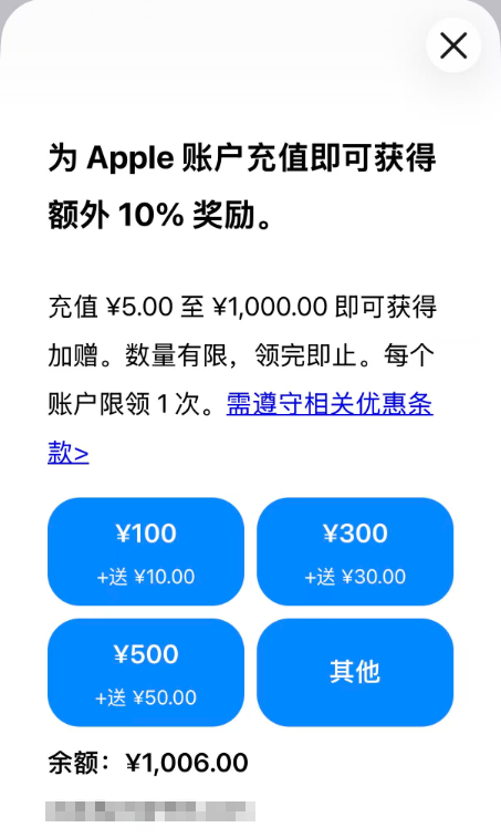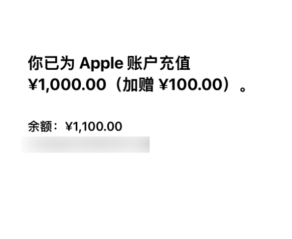 4月25日,苹果App Store中国区上线限时充值优惠活动,充值可额外获赠10%金额,最高充1000元送100元,相当于账户到账1100元,数量有限,领完即止。