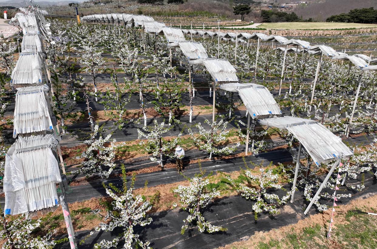 4月25日,果农在河北省秦皇岛市山海关区樱桃种植示范基地给樱桃树疏花(无人机照片)。新华社记者 杨世尧 摄