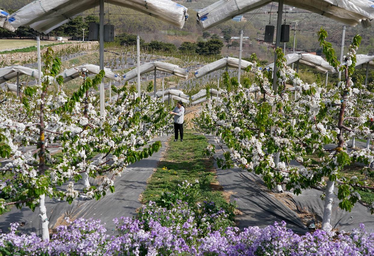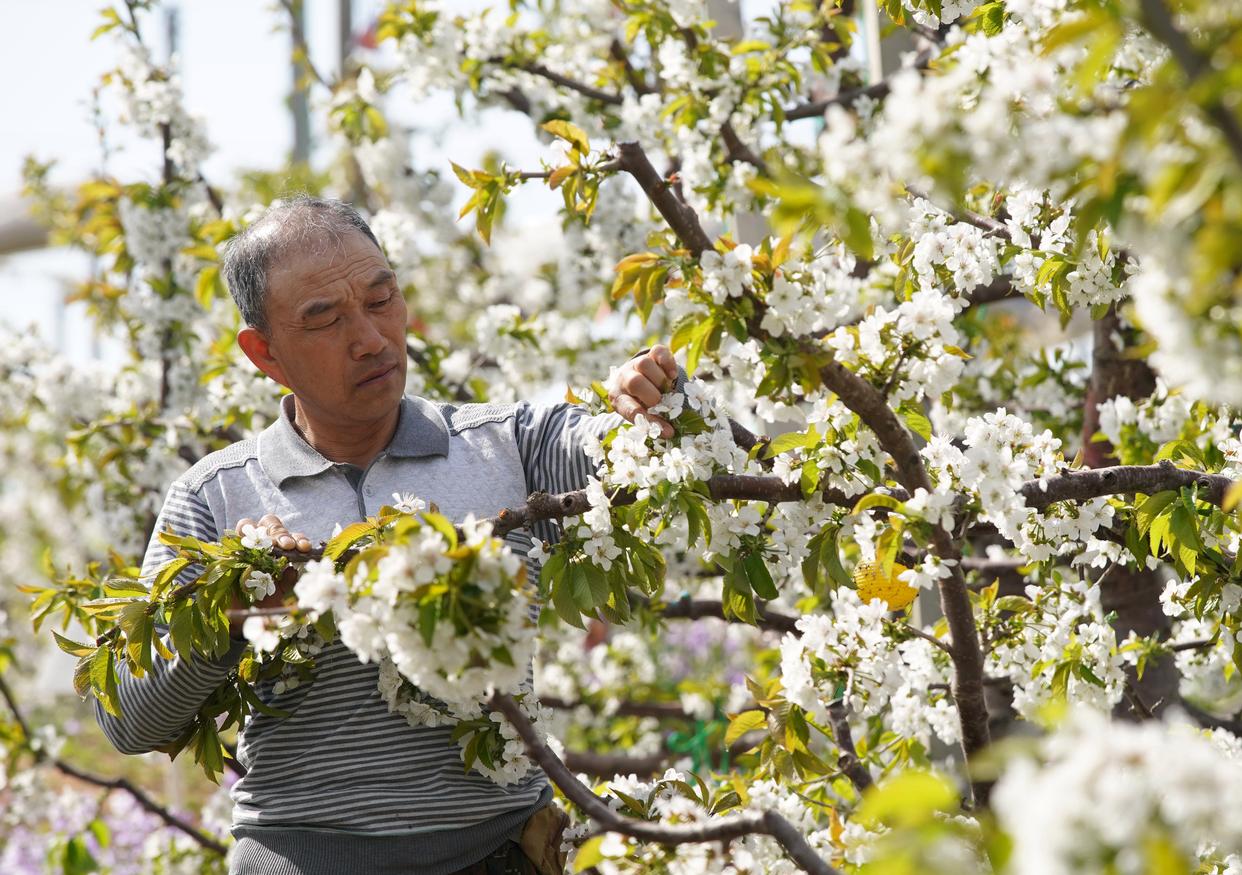 近日,河北省秦皇岛市山海关区的3万多亩樱桃树陆续开花,果农抢抓农时进行疏花授粉。