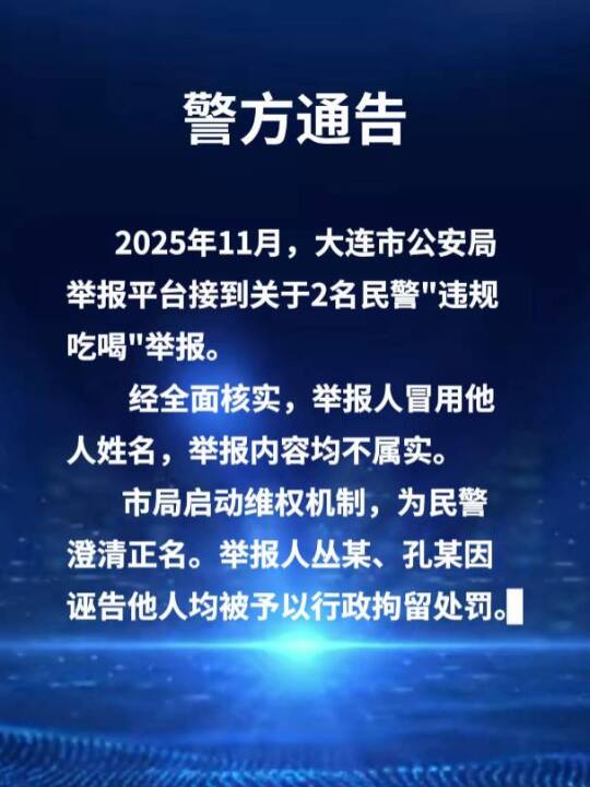 2025年11月,大连市公安局举报平台接到关于2名民警“违规吃喝”举报。经全面核实,举报人冒用他人姓名,举报内容均不属实。大连市公安局启动维权机制,为民警澄清正名。举报人丛某、孔某因诬告他人均被予以行政拘留处罚。