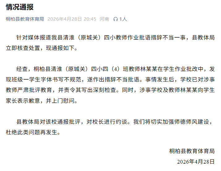 针对媒体报道我县清淮(原城关)四小教师作业批语措辞不当一事,县教体局立即核查处置,现通报如下。