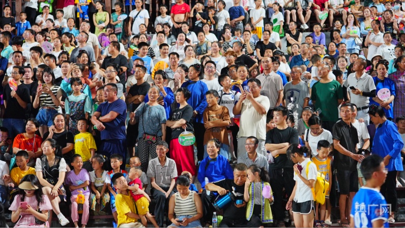 除了挑着土特产品入场的“啦啦队”,比赛中场休息时,侗族大歌、苗族芦笙舞、民族服饰展示都极具当地特色。当舞者与现场观众手拉手跳起民族风情舞蹈更是带动全场狂欢,被网友称作是最“炫”民族风。