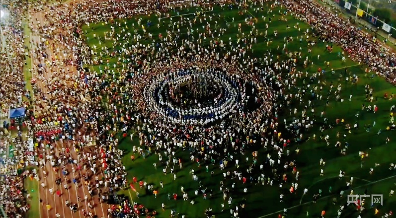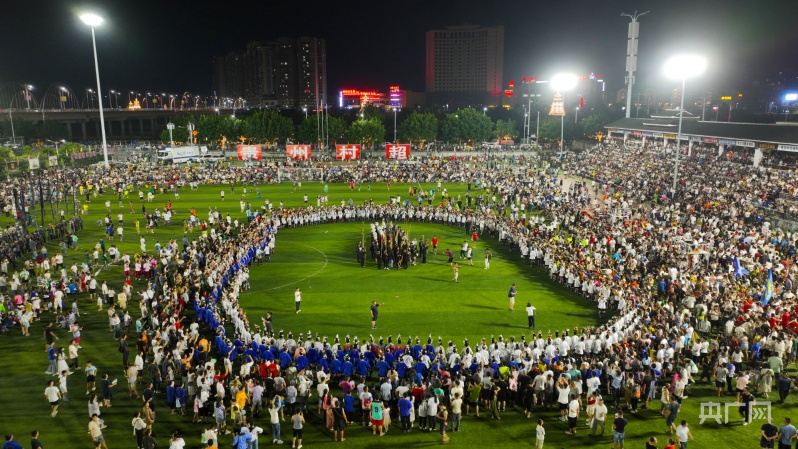 舞者与现场观众在足球场上跳起民族风情舞蹈(央广网发榕江县融媒体中心供图)