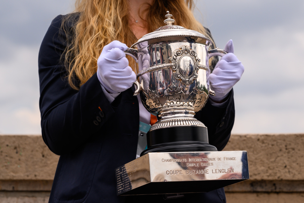 6月11日,工作人员捧出冠军奖杯苏珊·朗格朗杯。新华社发(朱利安·马蒂亚 摄)