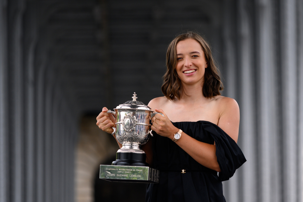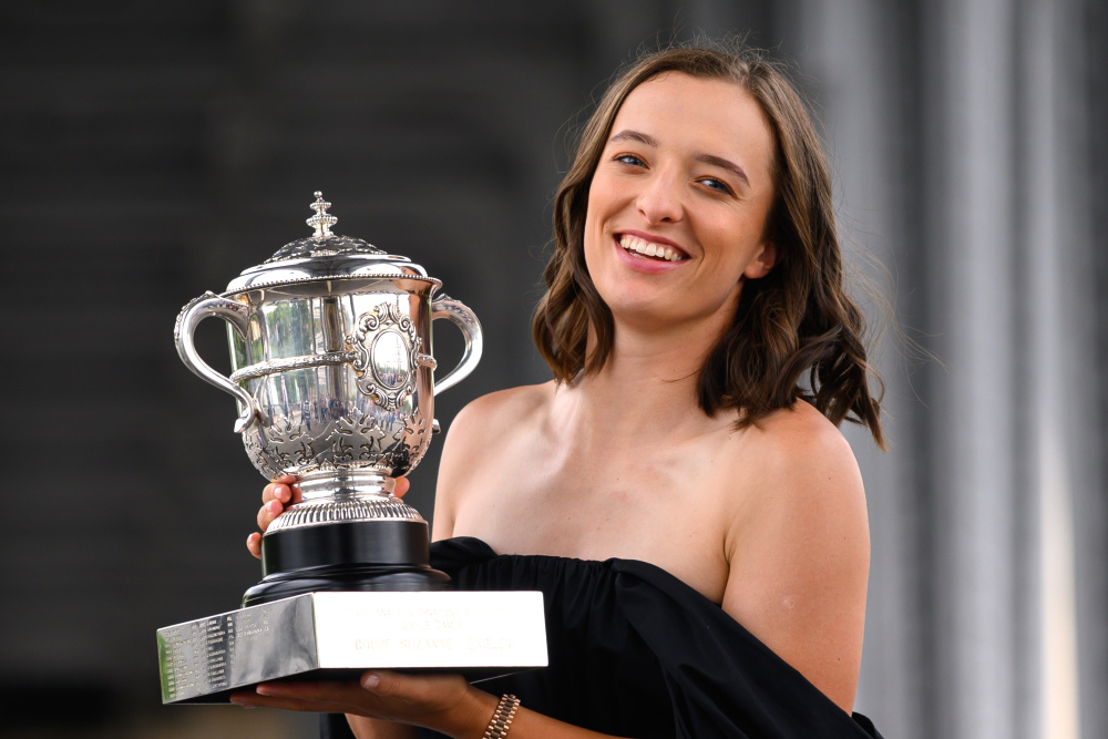 6月11日,斯维亚特克捧杯留影。新华社发(朱利安·马蒂亚 摄)