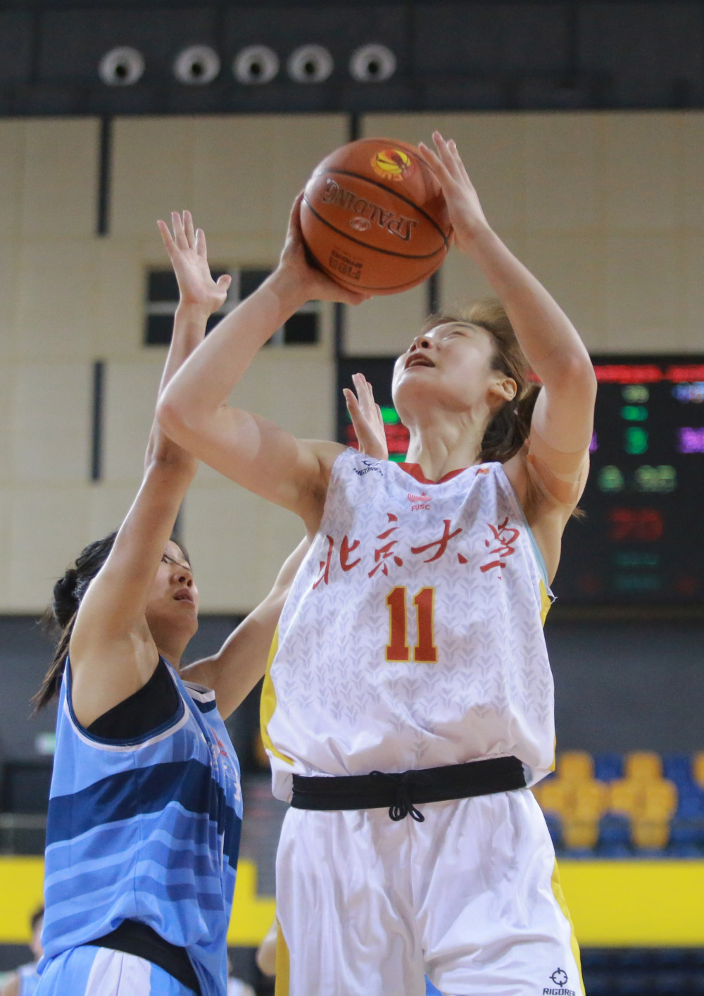 6月11日,北京大学队球员王家绘(右)投篮。新华社发(孟德龙摄)