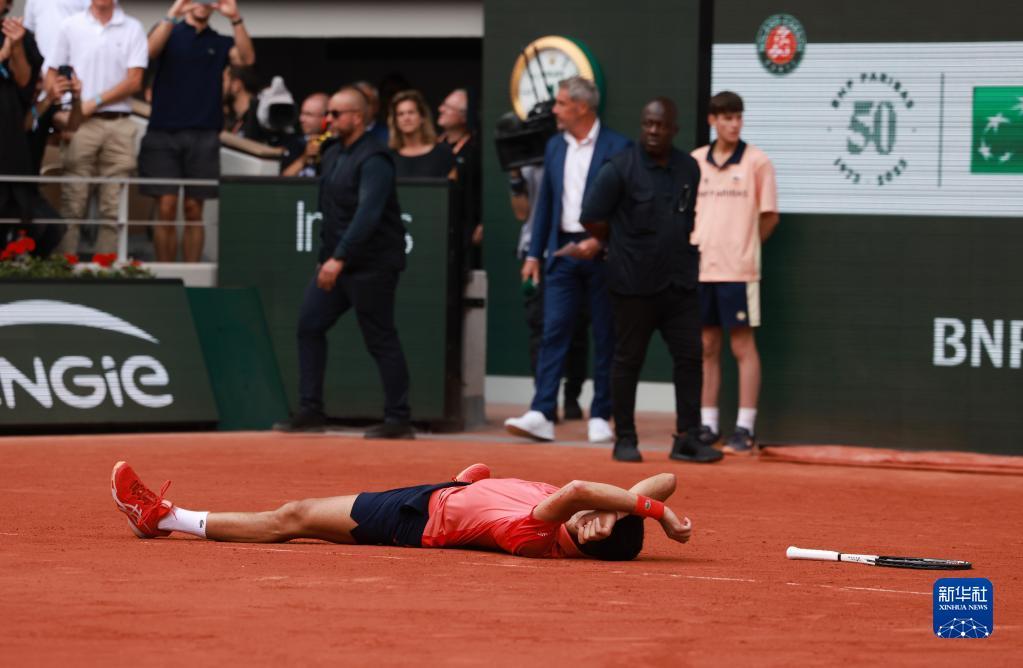 6月11日,焦科维奇获胜倒地。新华社记者高静摄