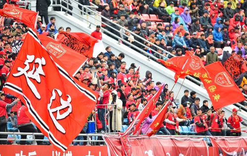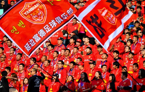 图为:延边富德队球迷为球队呐喊助威