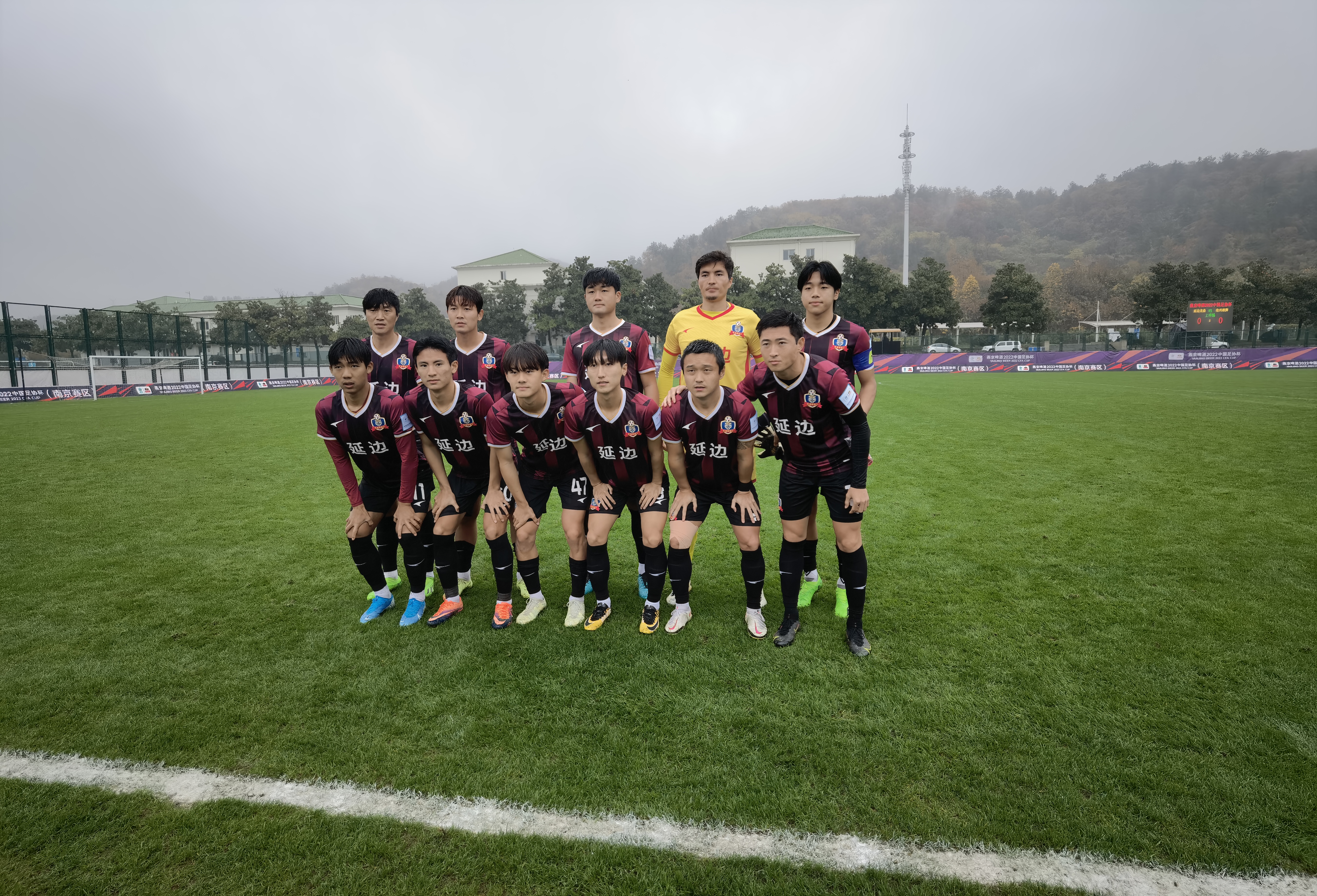 图为:延边龙鼎队在2022赛季中乙联赛的比赛前合影
