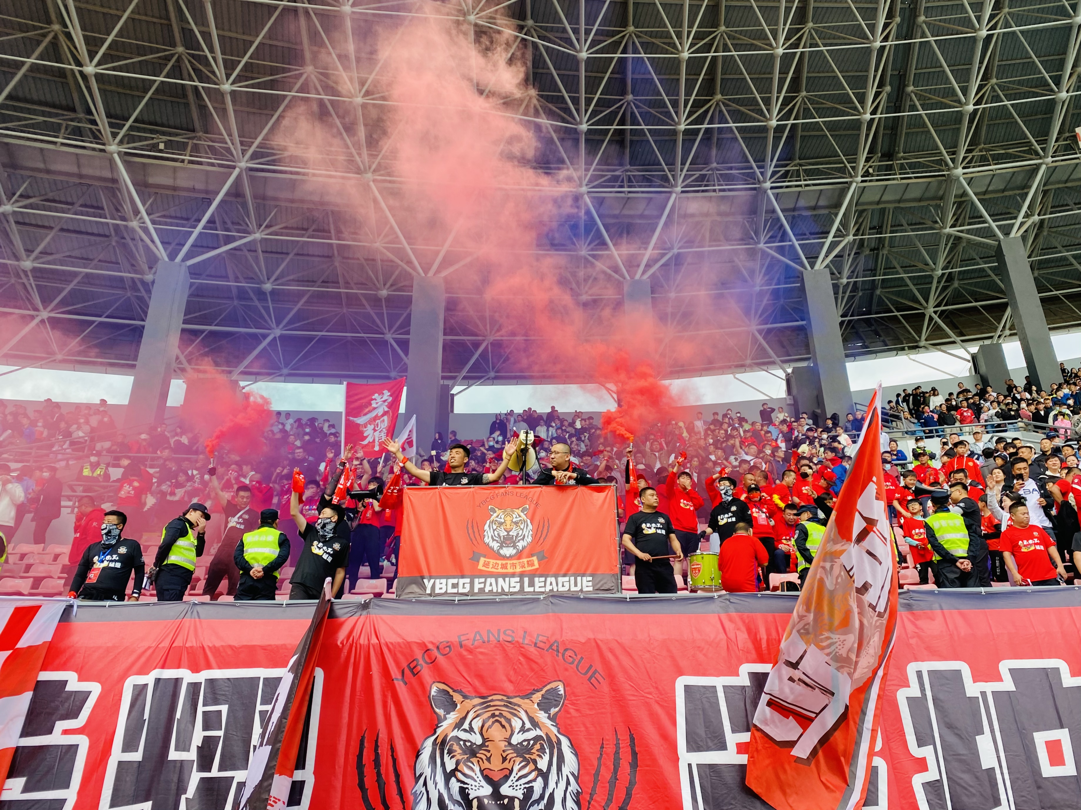 图为:延边富德队球迷在现场呐喊助威