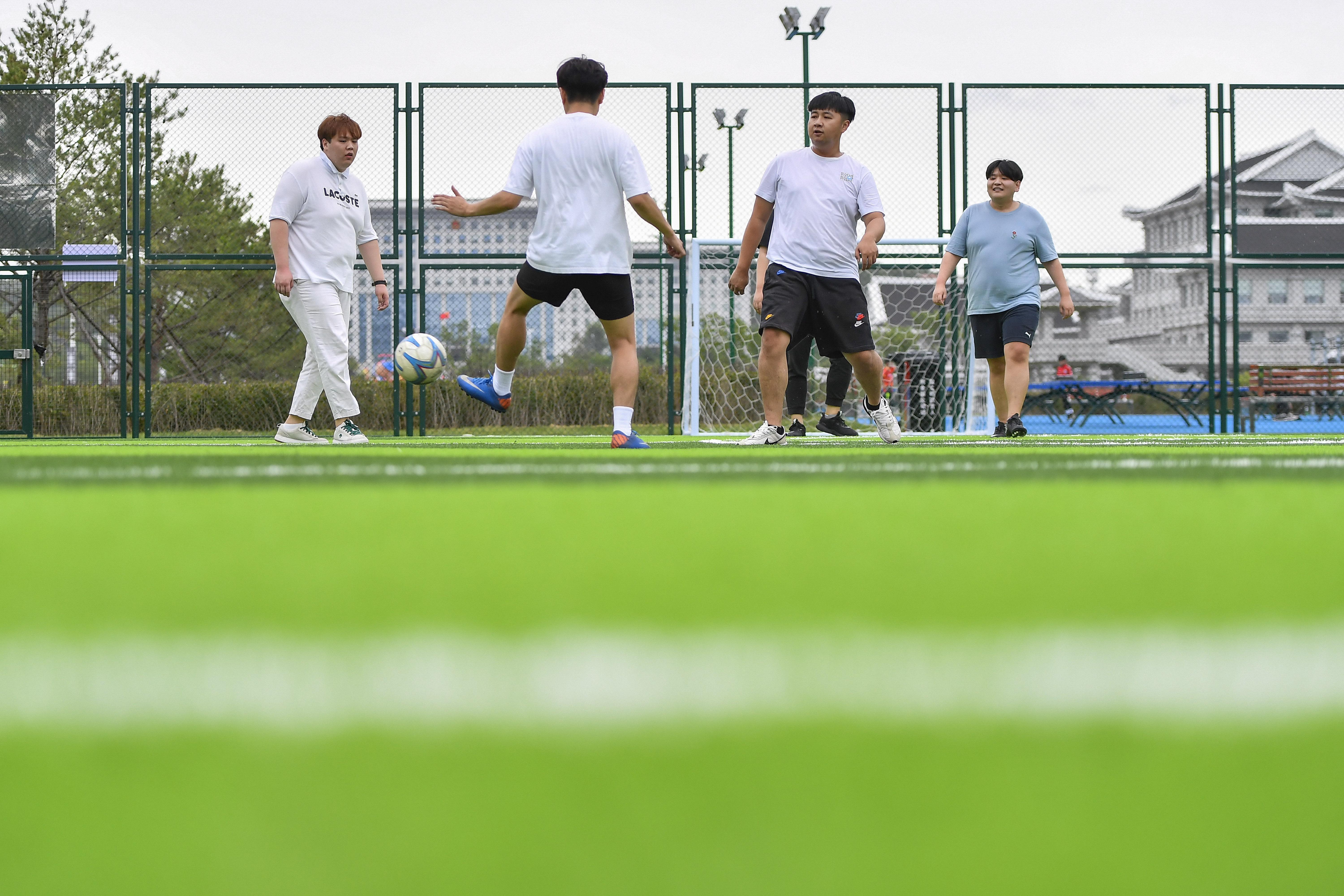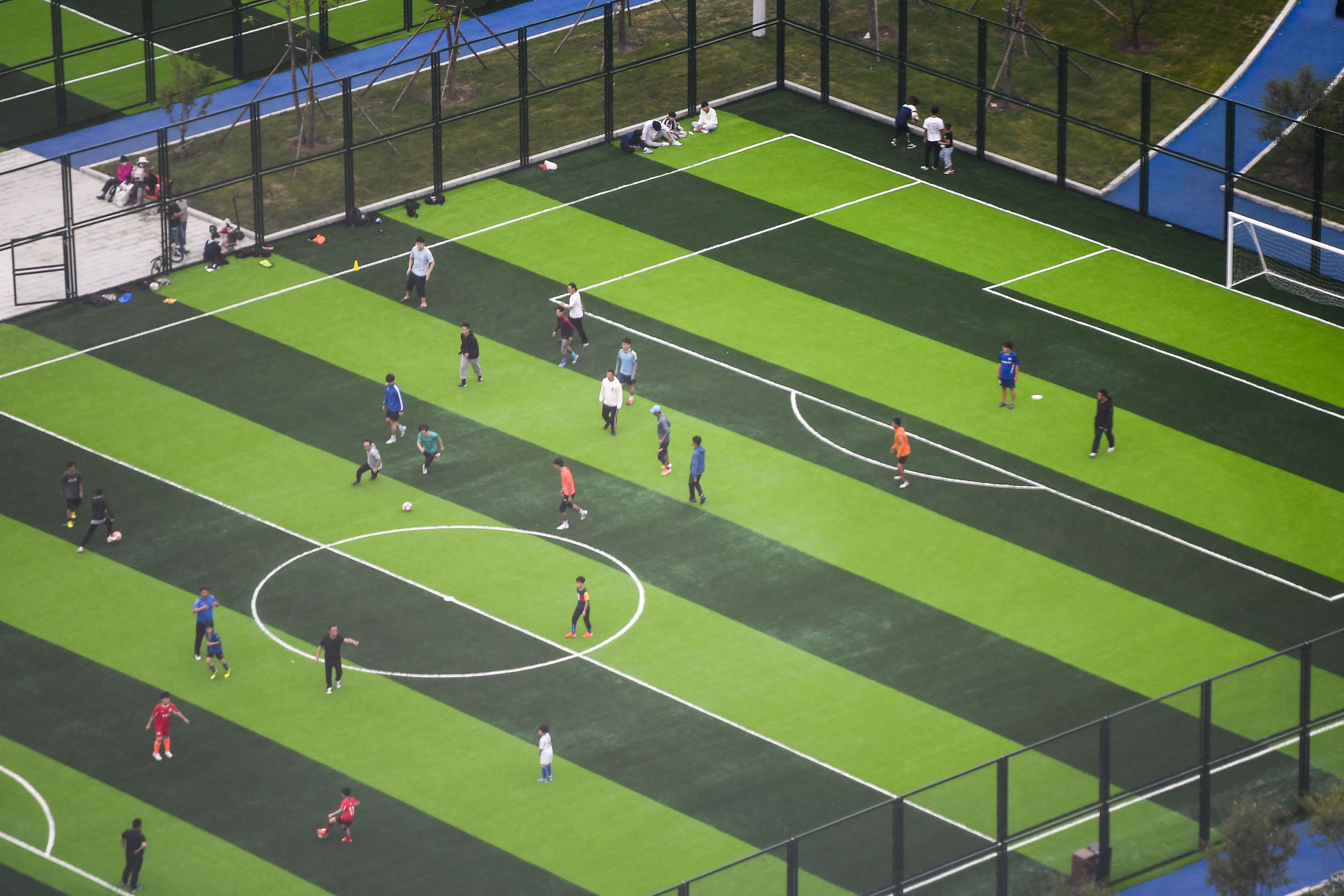 图为:在延边朝鲜族自治州延吉市阿里郎足球公园市民在球场踢球