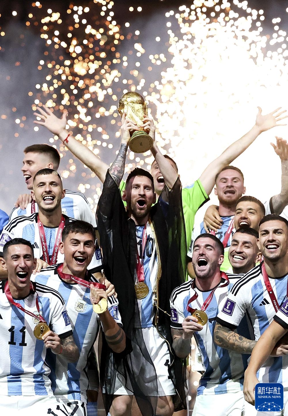⬆️2022年12月18日,阿根廷队球员梅西(中)在颁奖仪式上捧起大力神杯庆祝。新华社记者曹灿摄