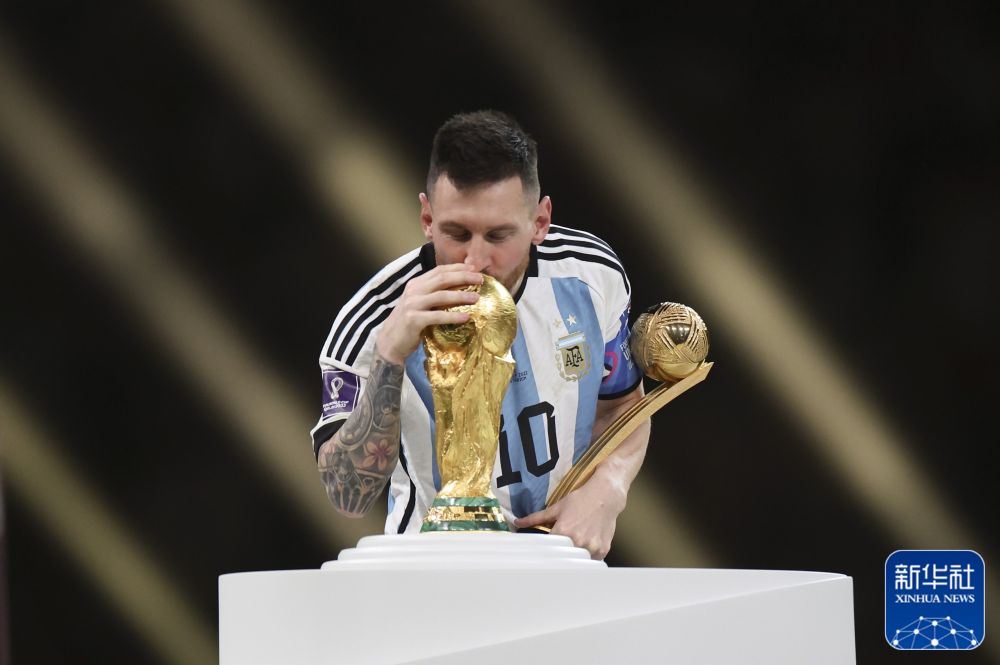 ⬆️2022年12月18日,获得世界杯金球奖的阿根廷队球员梅西在颁奖仪式上亲吻大力神杯。新华社记者曹灿摄