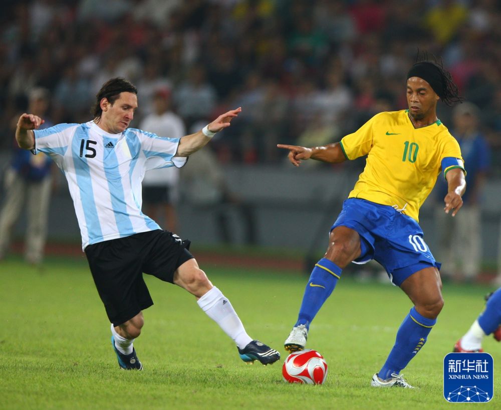 ⬆️2008年8月19日,阿根廷队球员梅西(左)与巴西队球员罗纳尔迪尼奥在工人体育场进行的北京奥运会男足半决赛中拼抢。新华社记者龚兵摄