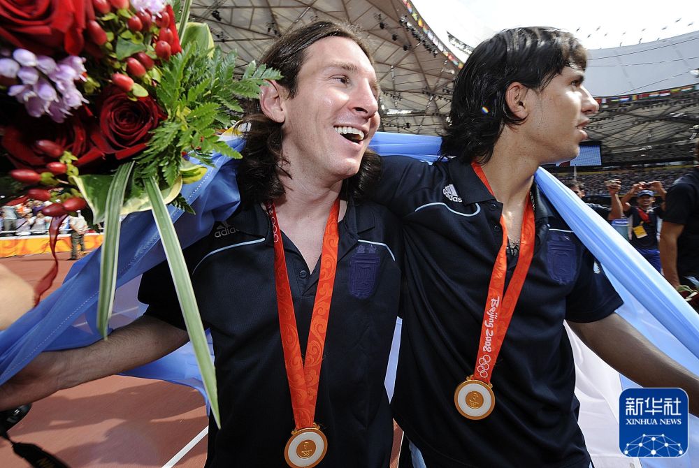⬆️2008年8月23日,阿根廷队球员梅西(左)在北京“鸟巢”举行的北京奥运会男足决赛中后与队友庆祝胜利。新华社记者吴晓凌摄