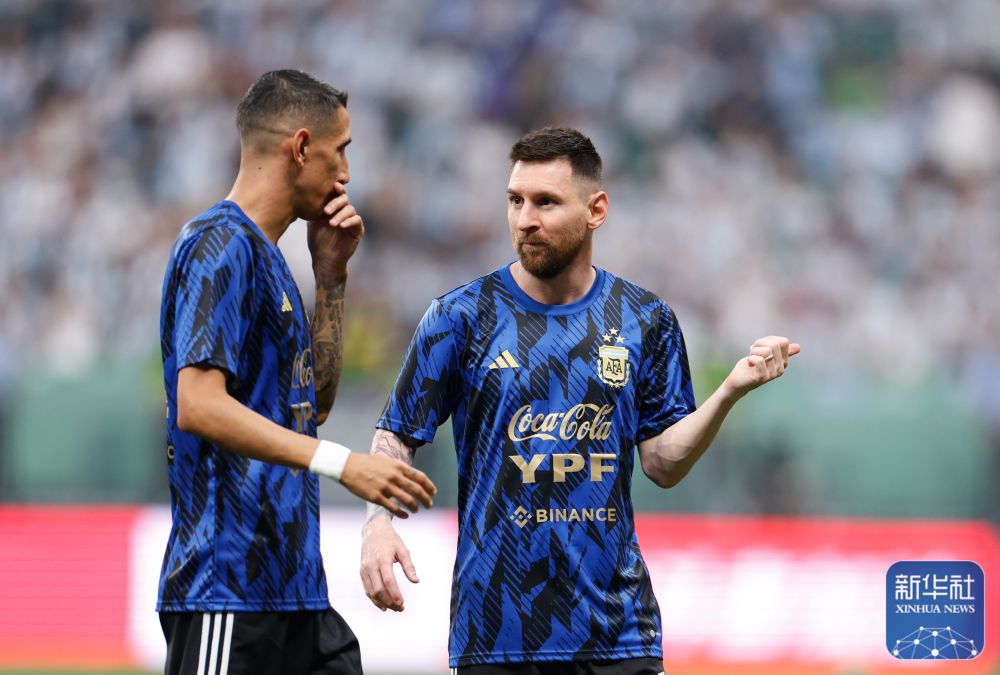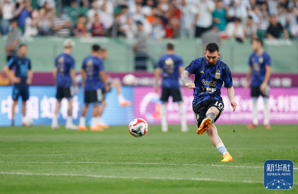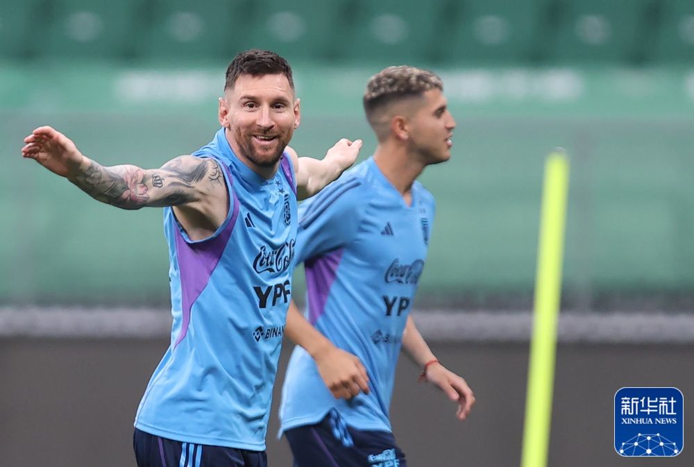 ⬆️6月14日,阿根廷队球员梅西(左)在北京工人体育场进行赛前训练。新华社记者贾浩成摄