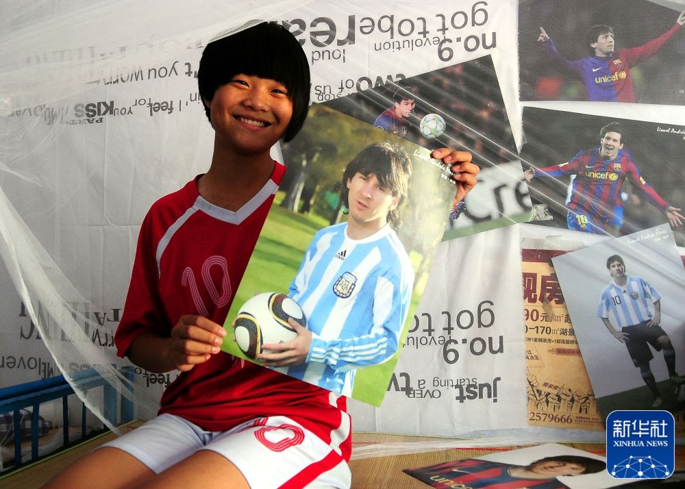 ⬆️2013年6月20日,尚良慧展示偶像球星梅西的海报,她与梅西穿着同样的10号球衣,她说她最大的梦想就是有一天能见到梅西。新华社发(房德华摄)
