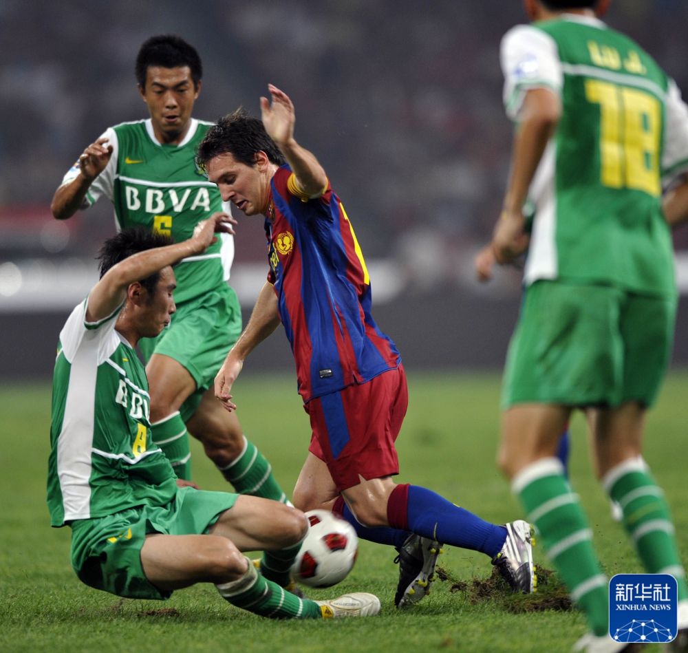 ⬆️2010年8月8日,巴塞罗那队球员梅西(中)在北京“鸟巢”与北京国安队的友谊赛中带球突破。新华社记者陶希夷摄