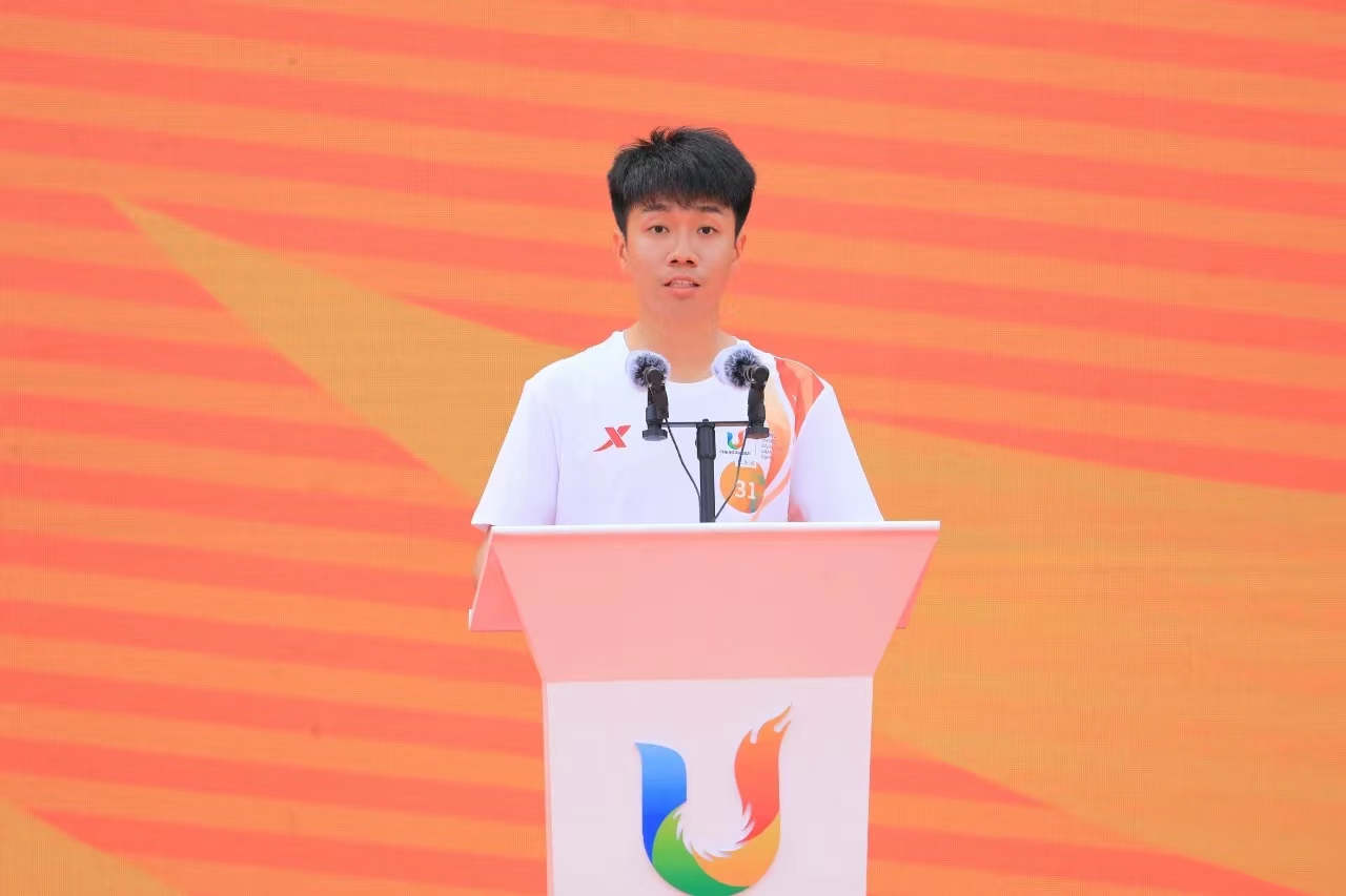 火炬手代表马博宇来自荣获第27届“中国青年五四奖章集体”哈工大问天舱机械臂团队。马博宇发言表示,这不仅是大运精神的传递,更是复兴伟业的接力。