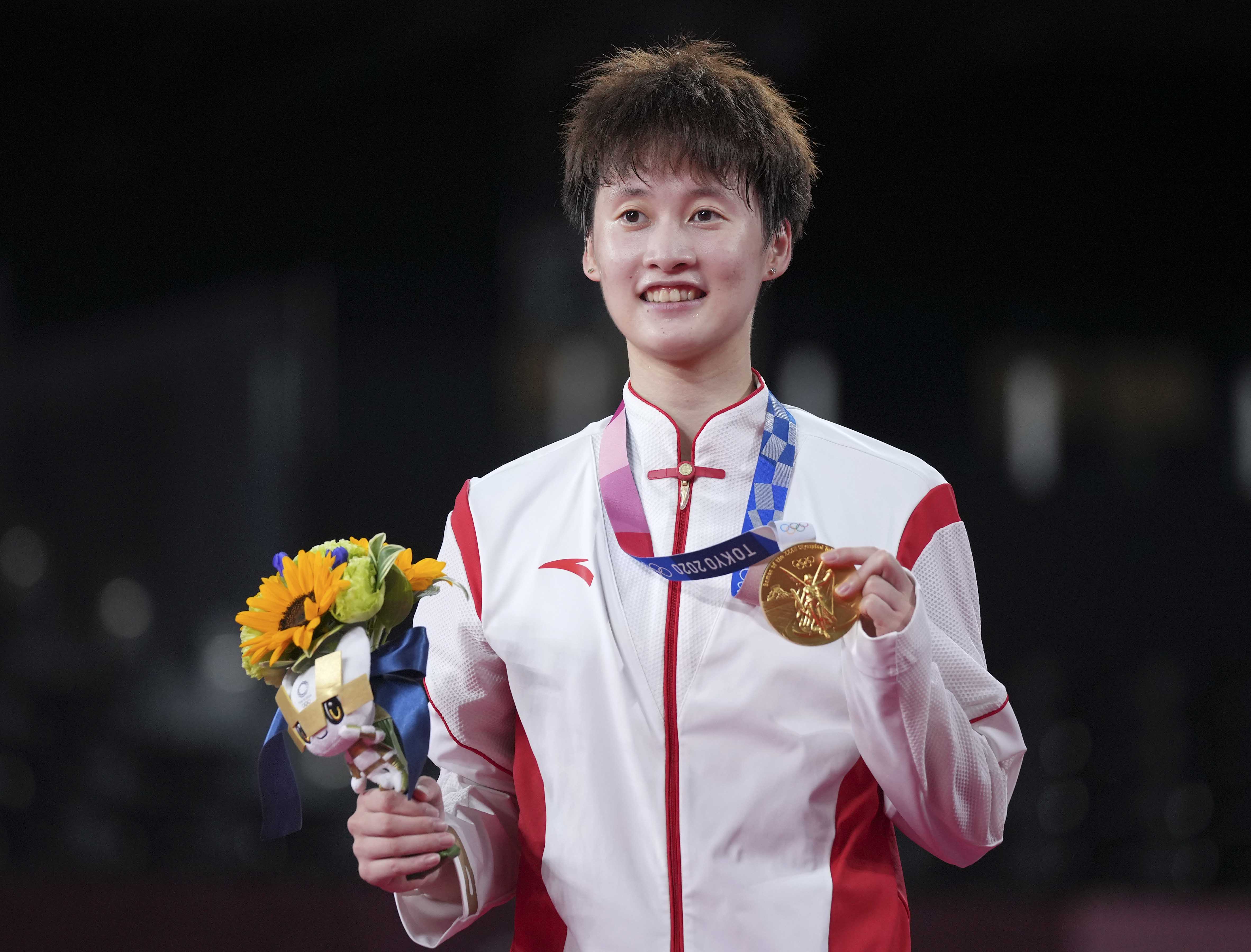 2021年8月1日,陈雨菲在颁奖仪式上。当日,在东京奥运会羽毛球女子单打决赛中,中国选手陈雨菲以2比1战胜中国台北选手戴资颖,夺得金牌。新华社记者薛玉斌摄